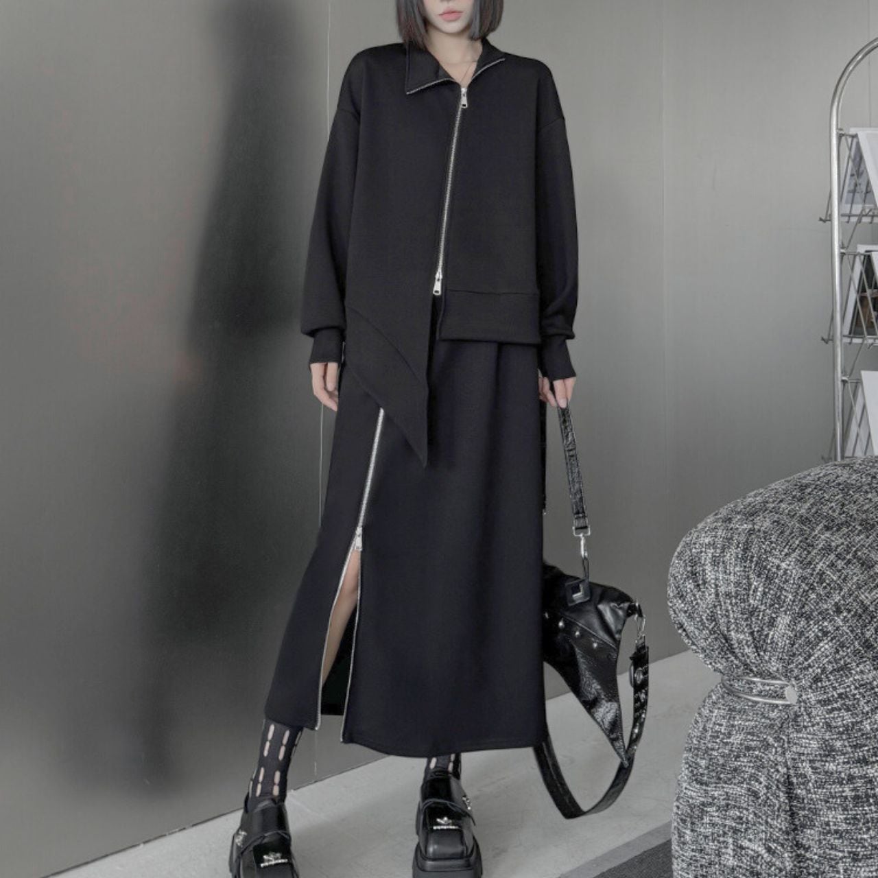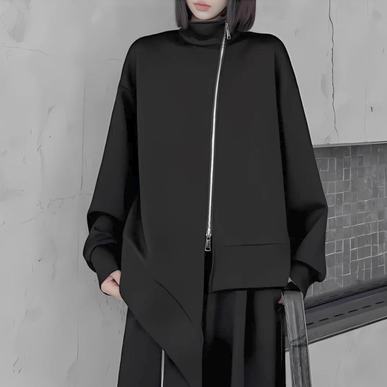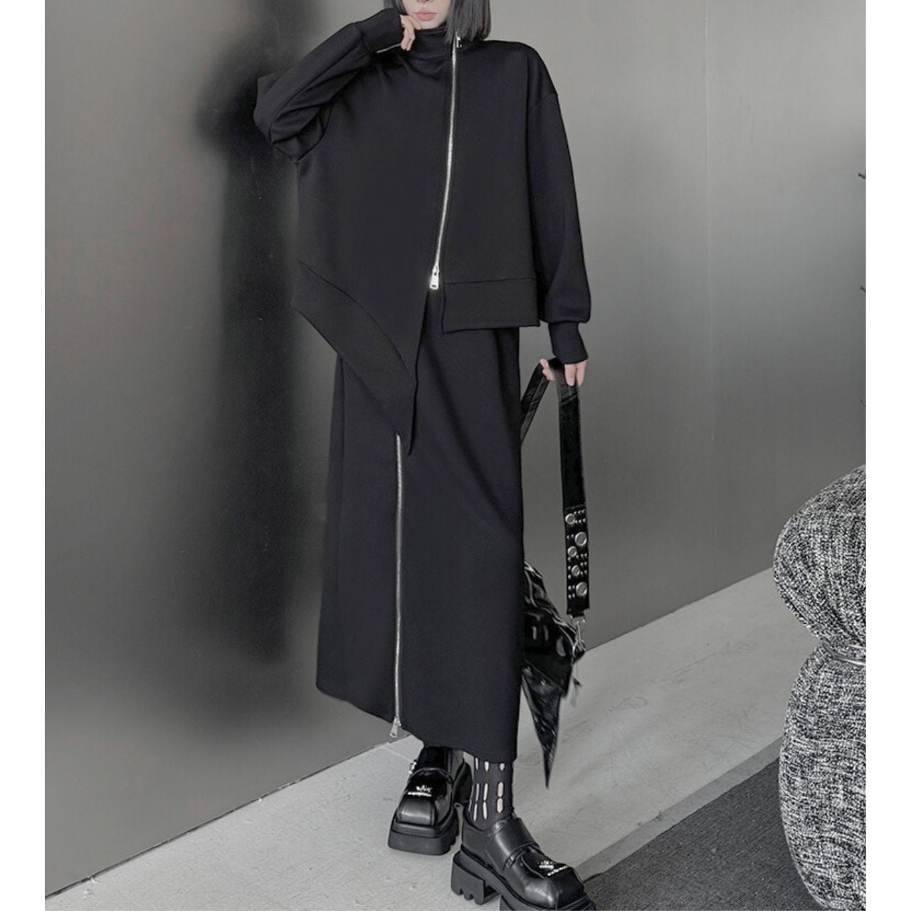 アシンメトリーなシルエットが個性を引き立て、クールなスタイルを確立します。