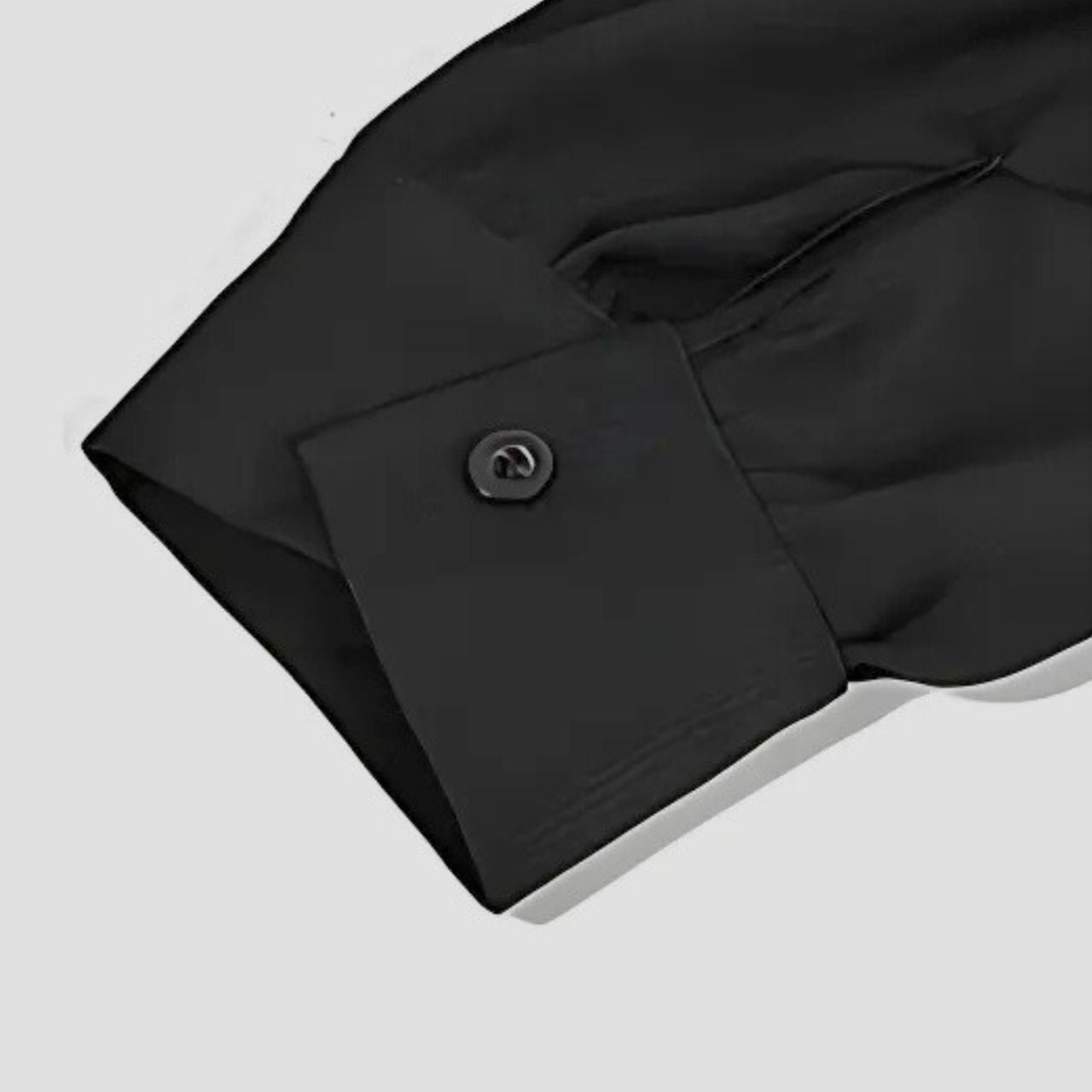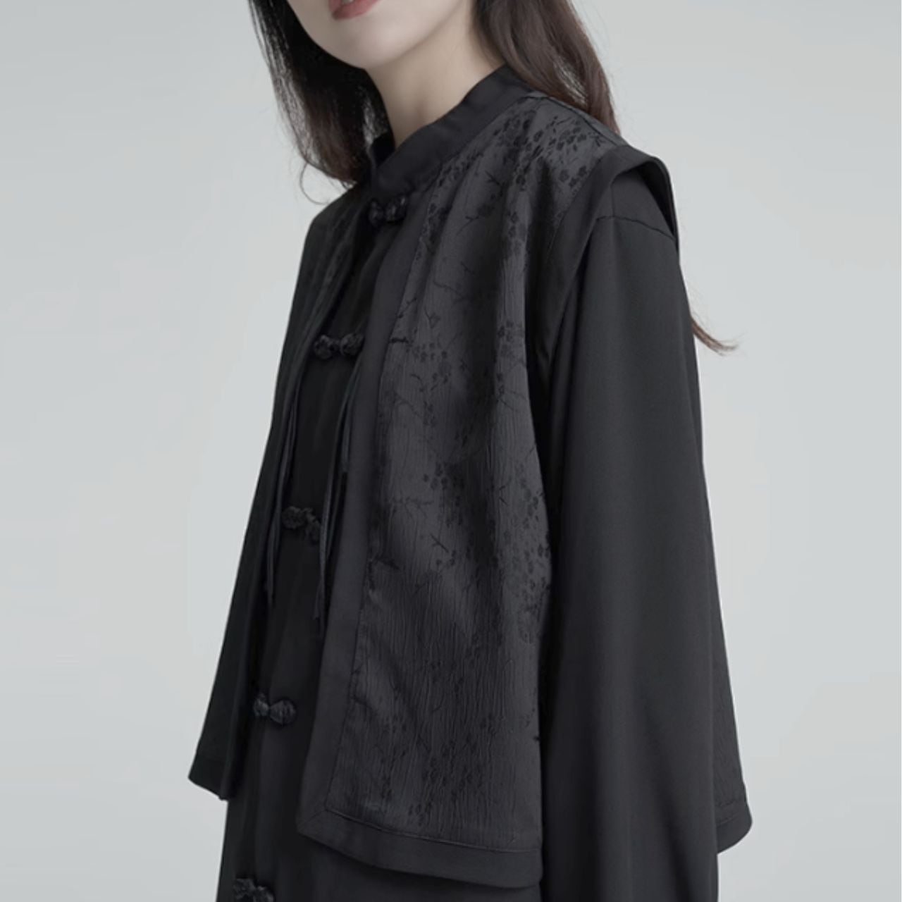 フロントにあしらわれたチャイナボタンと、さりげなく光を受けるジャカード生地がモードな存在感を放ちます。