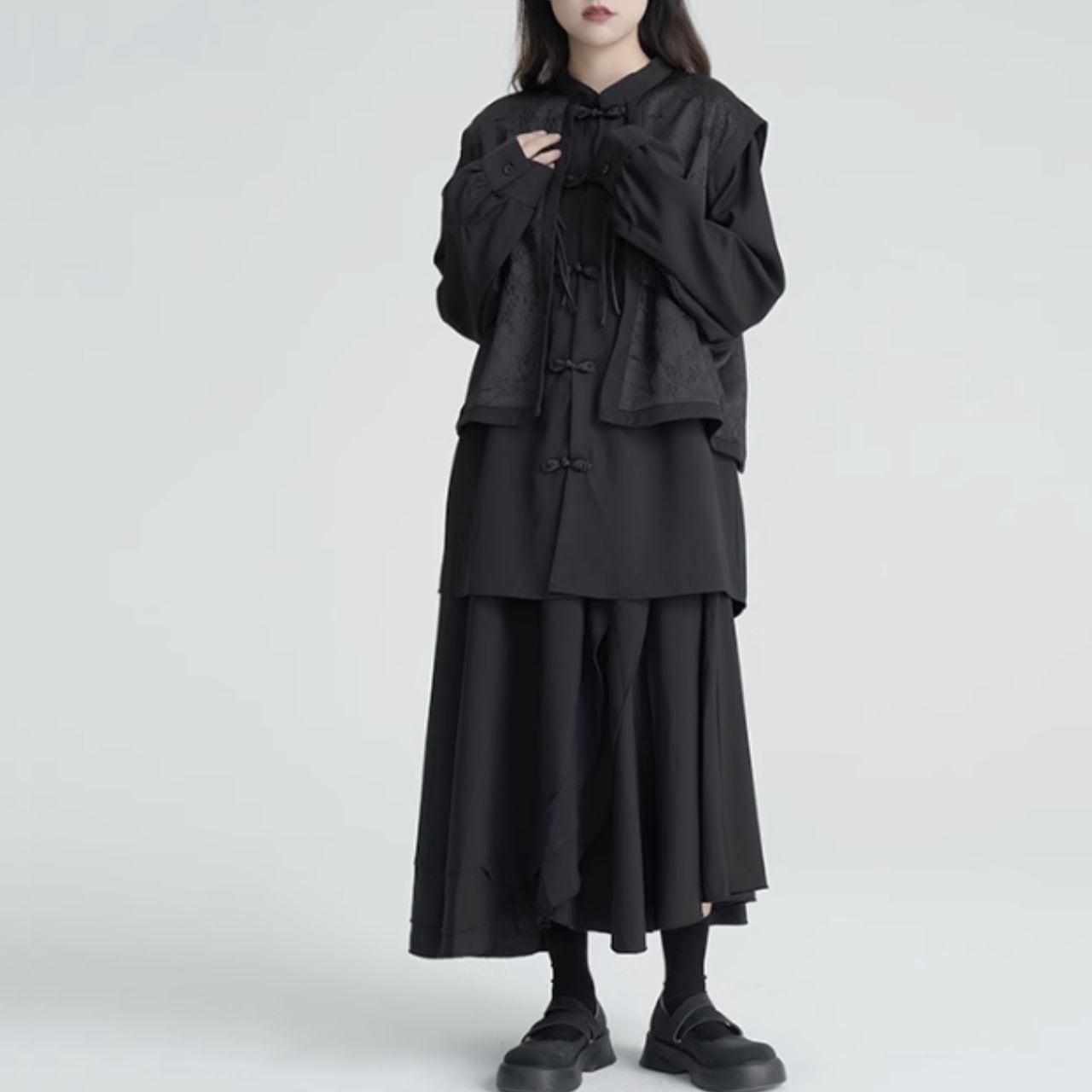 まるでベストを重ね着したようなレイヤードデザインが印象的なロングシャツ。