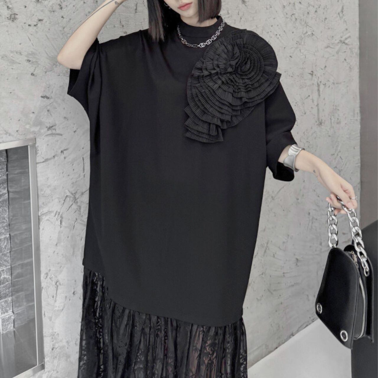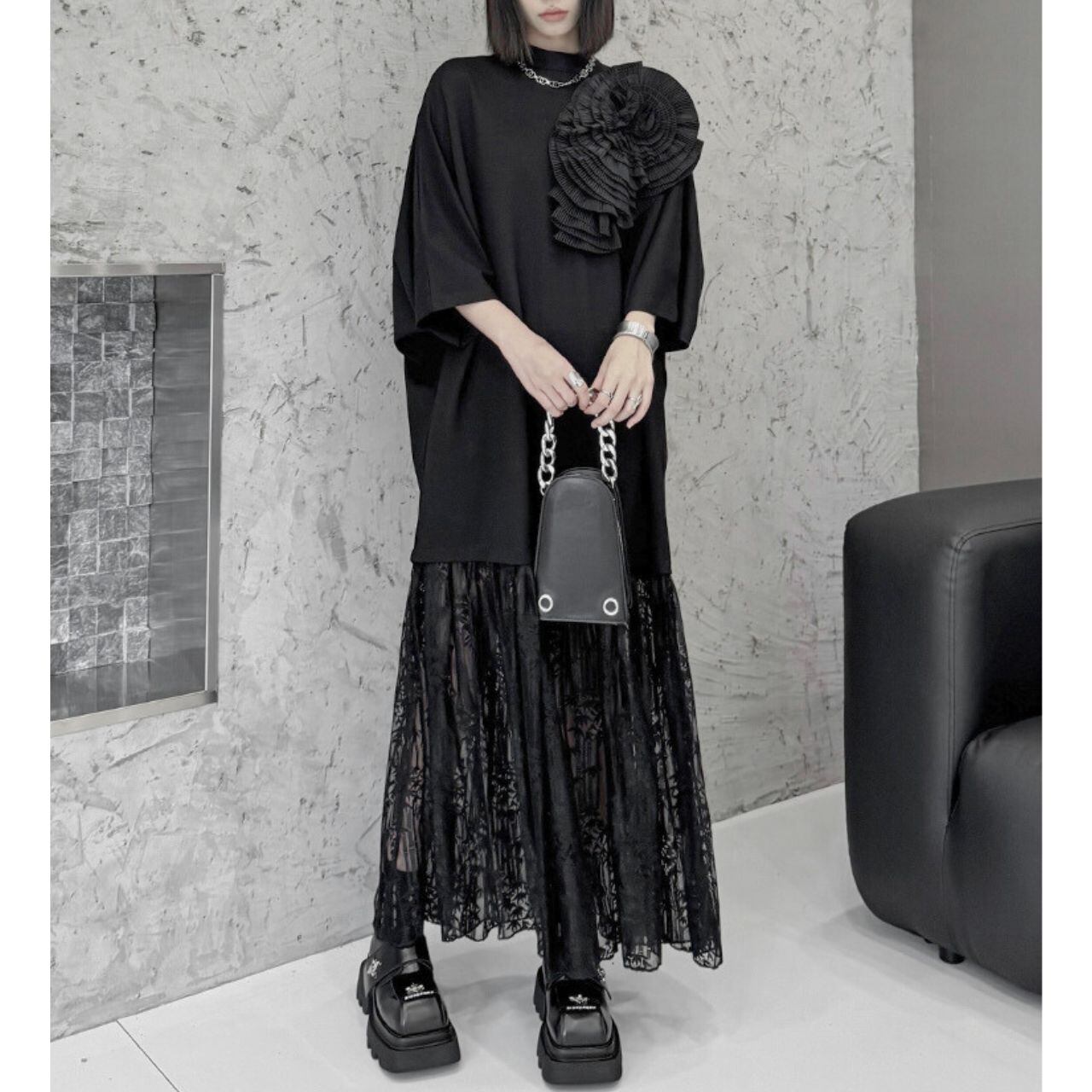 上品なフラワーレースが施されたデザインで女性らしさを引き立てつつ、ゆったりとしたシルエットで快適さも兼ね備えています。