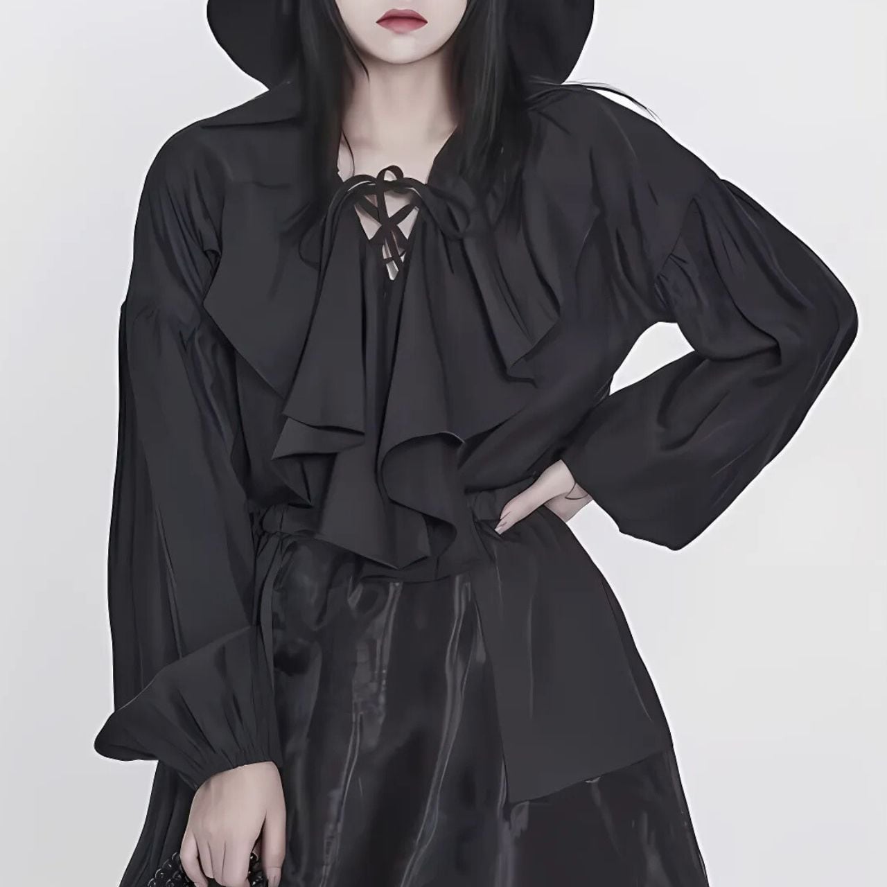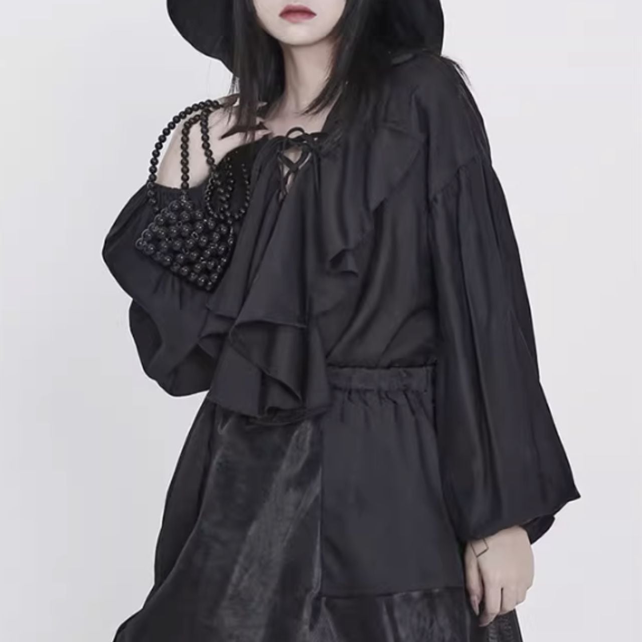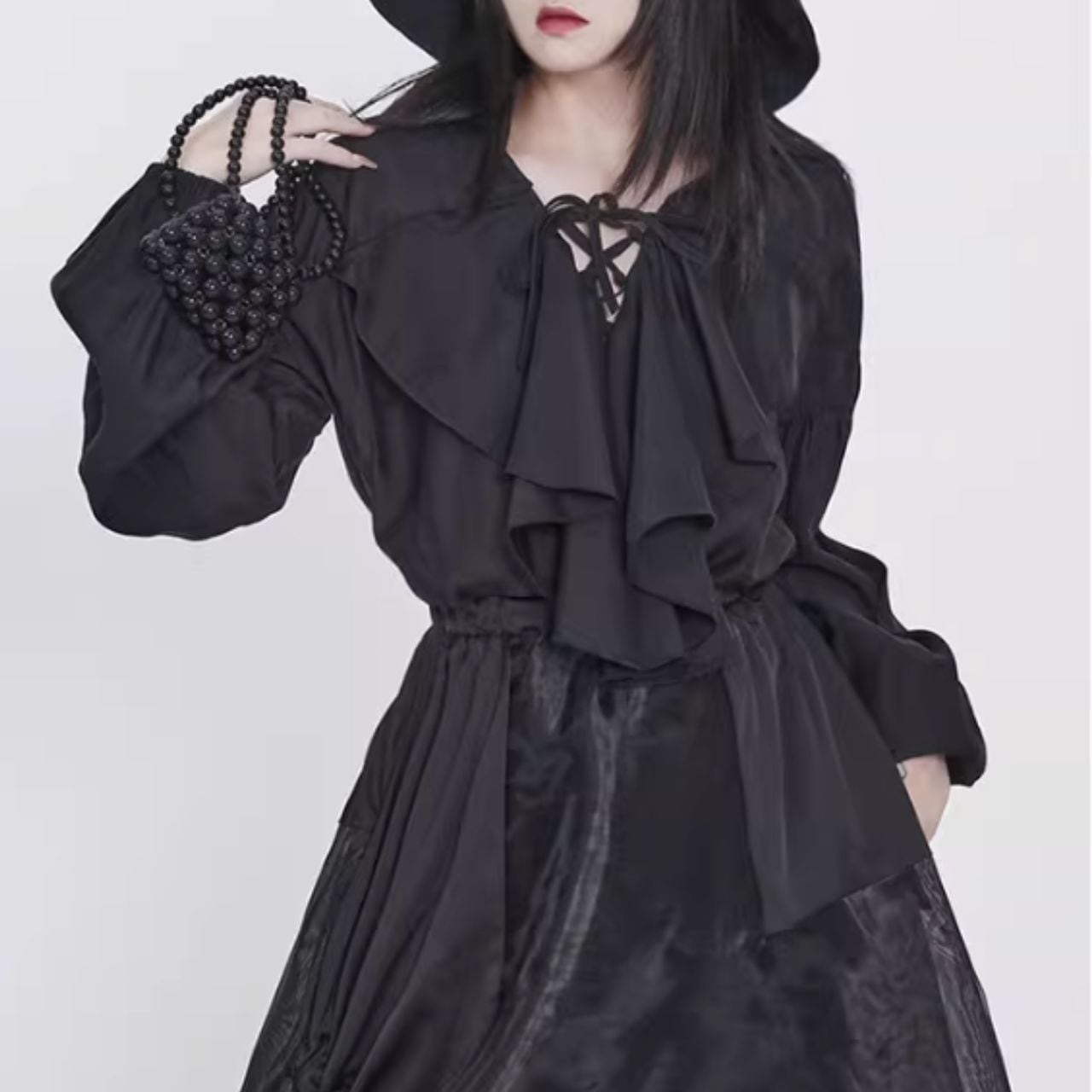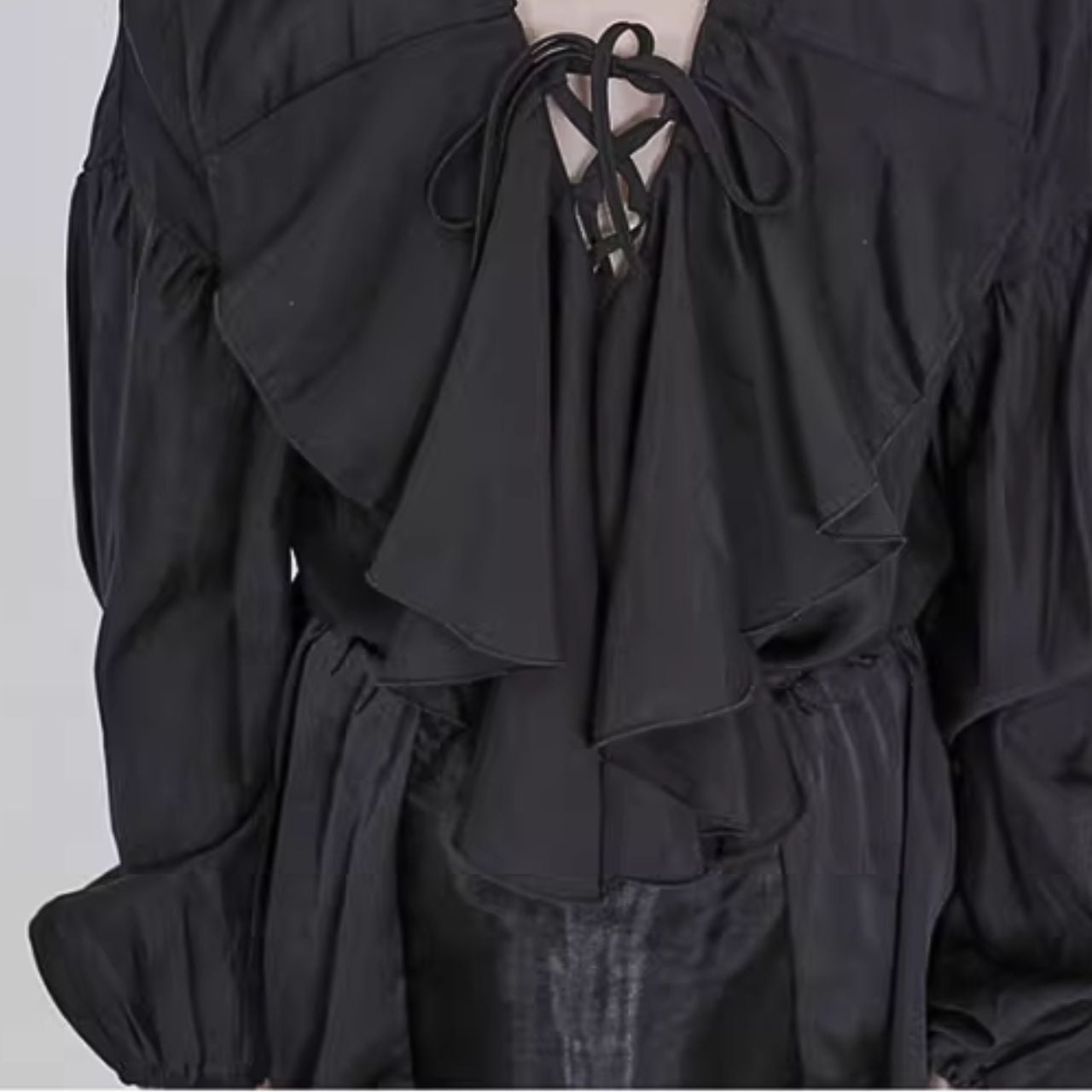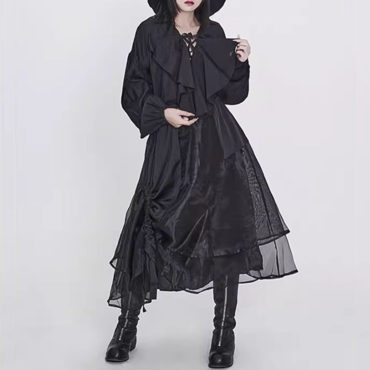襟のドレープデザインが特徴的で、全体に広がるボリュームのある袖口が優雅さを加えます。