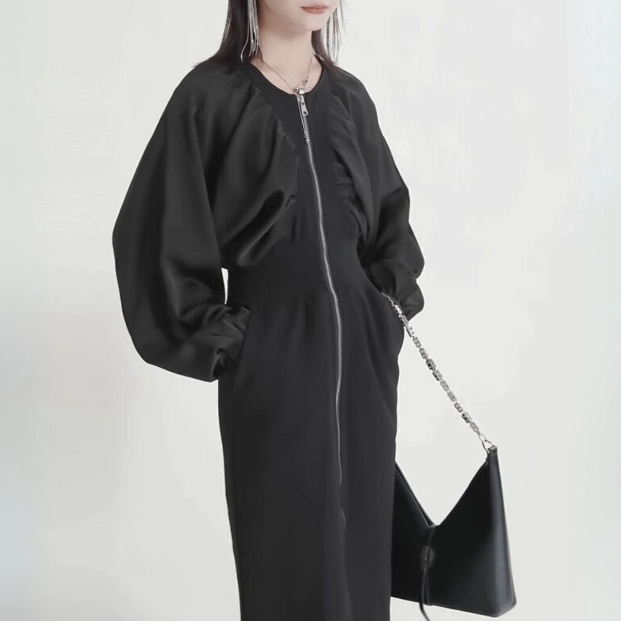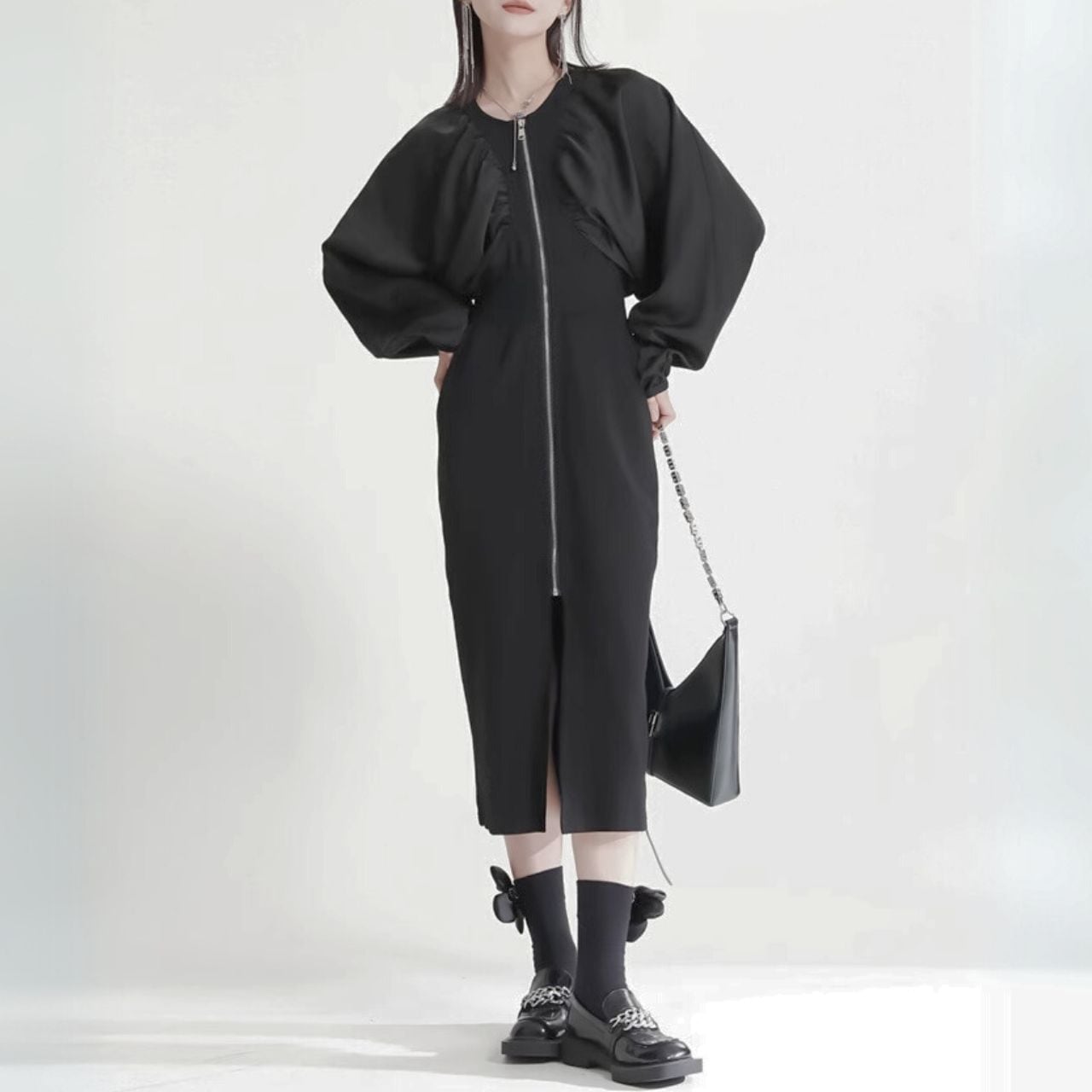 ミディアム丈と大胆なジッパー、セクシーなスリットが融合し、美しいシルエットで大人の女性にふさわしい気品と魅力を引き立てます。