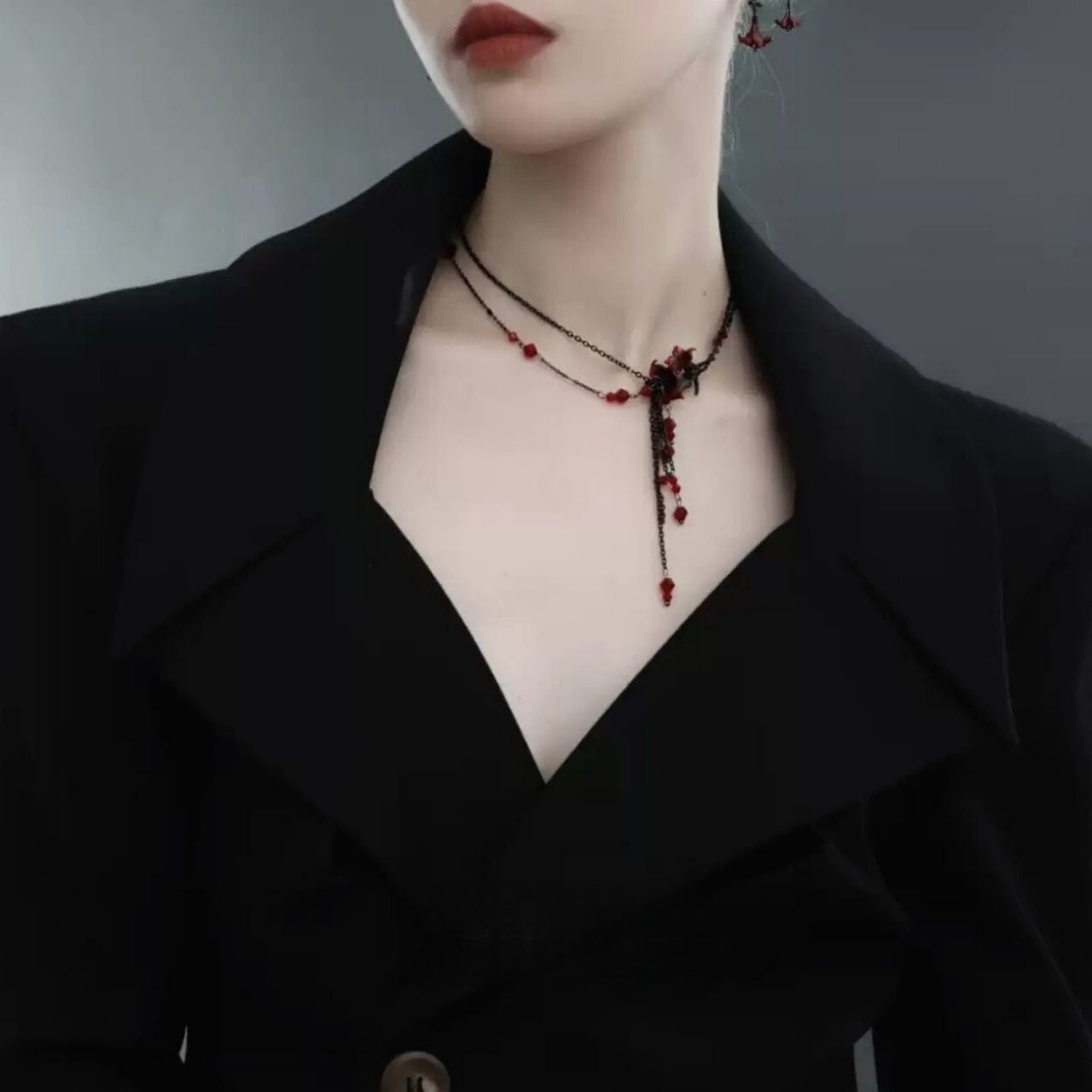 連なる深紅の花と、アシンメトリーに配置されたチェーンが美しいこのネックレスは、エレガントなデザインと独特の印象を兼ね備えています。