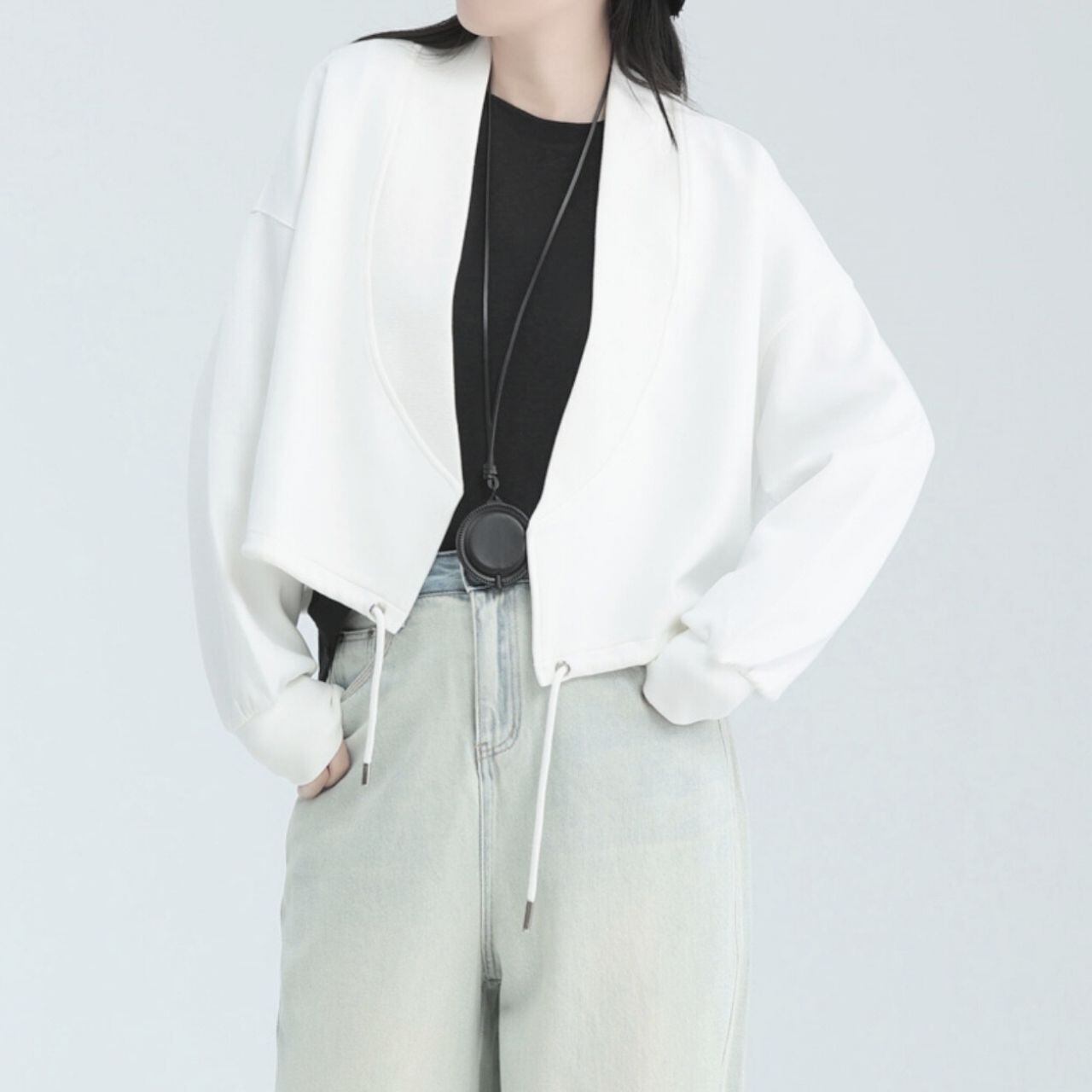 肩のラインをスッキリと見せるショートデザインが魅力のジャケット。