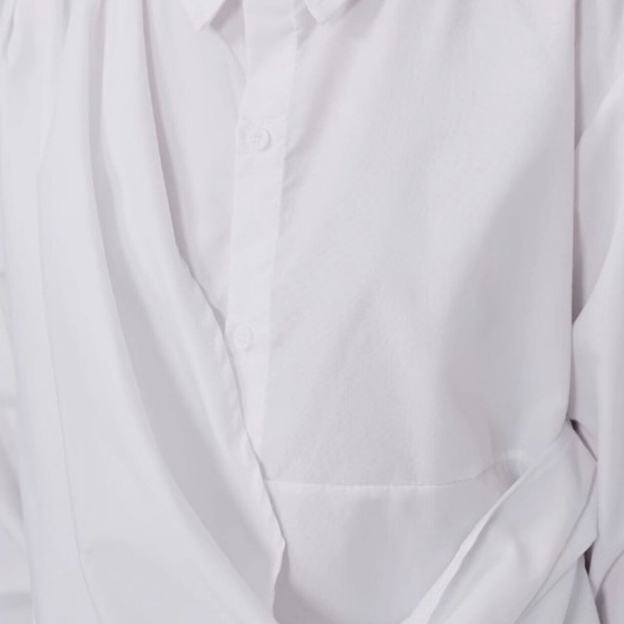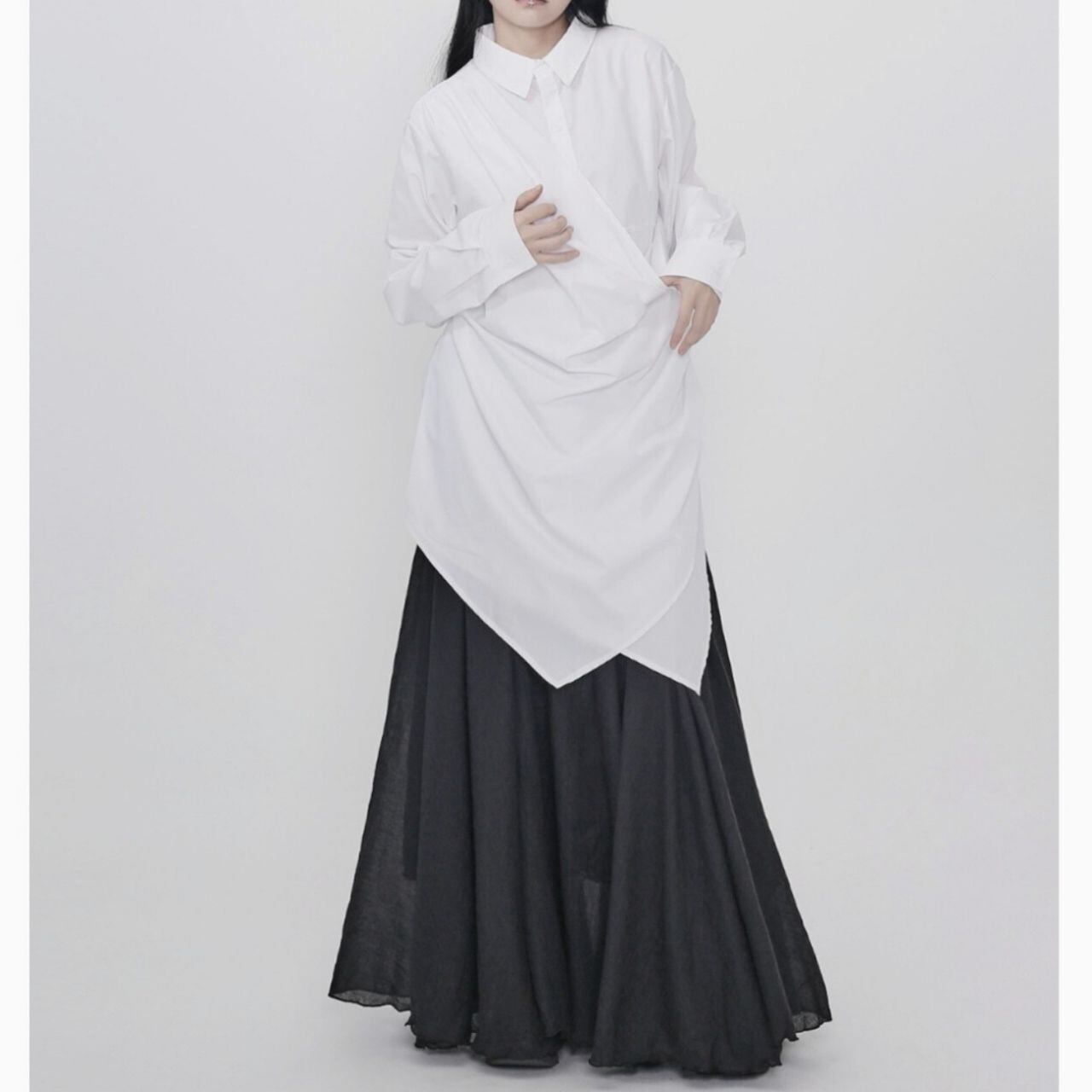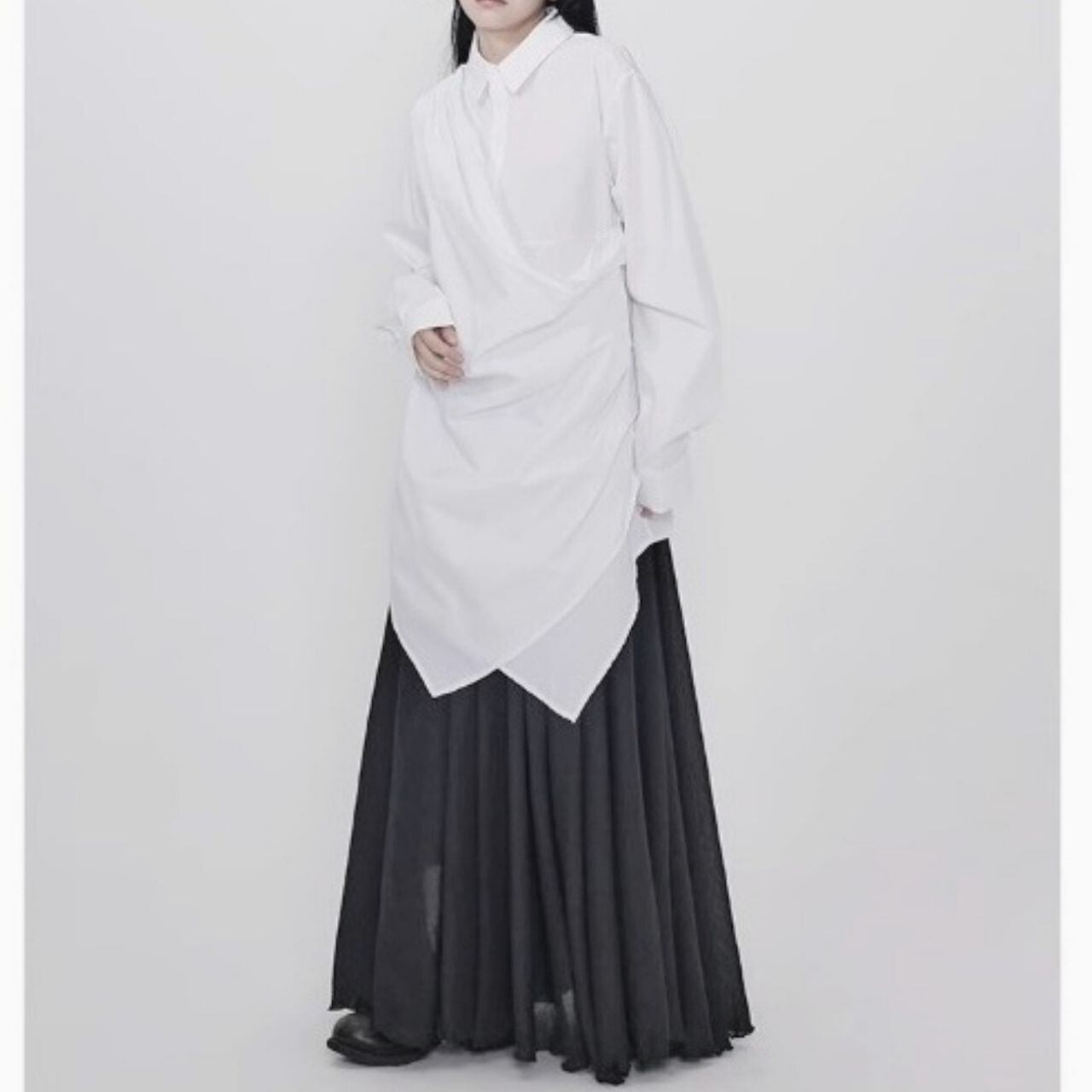再度から流れる美しいドレープが特徴的なシャツ。