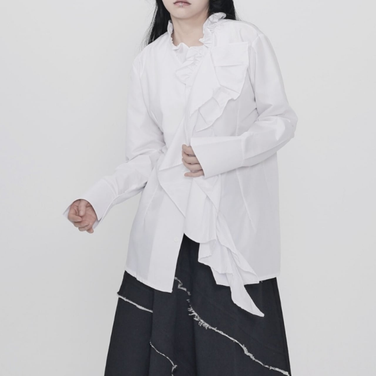 エレガントなスタンドカラーとラッフルデザインが魅力のシャツブラウス。