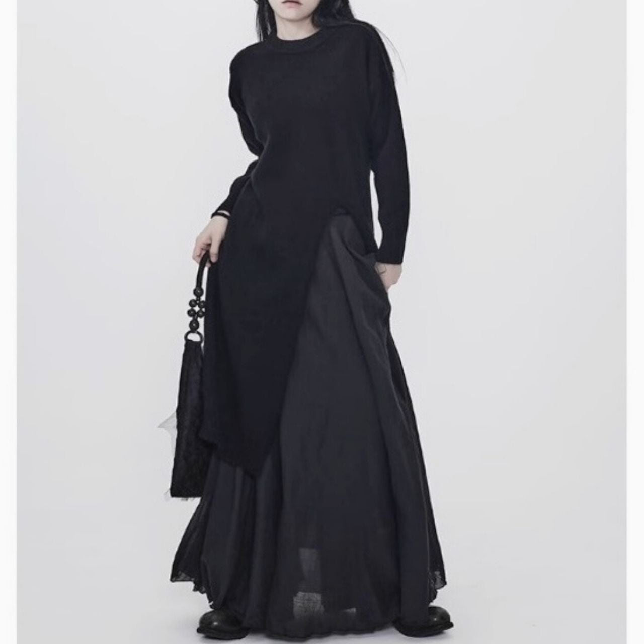 シンプルなデザインながら、大胆なスリットがモードな雰囲気を演出します。