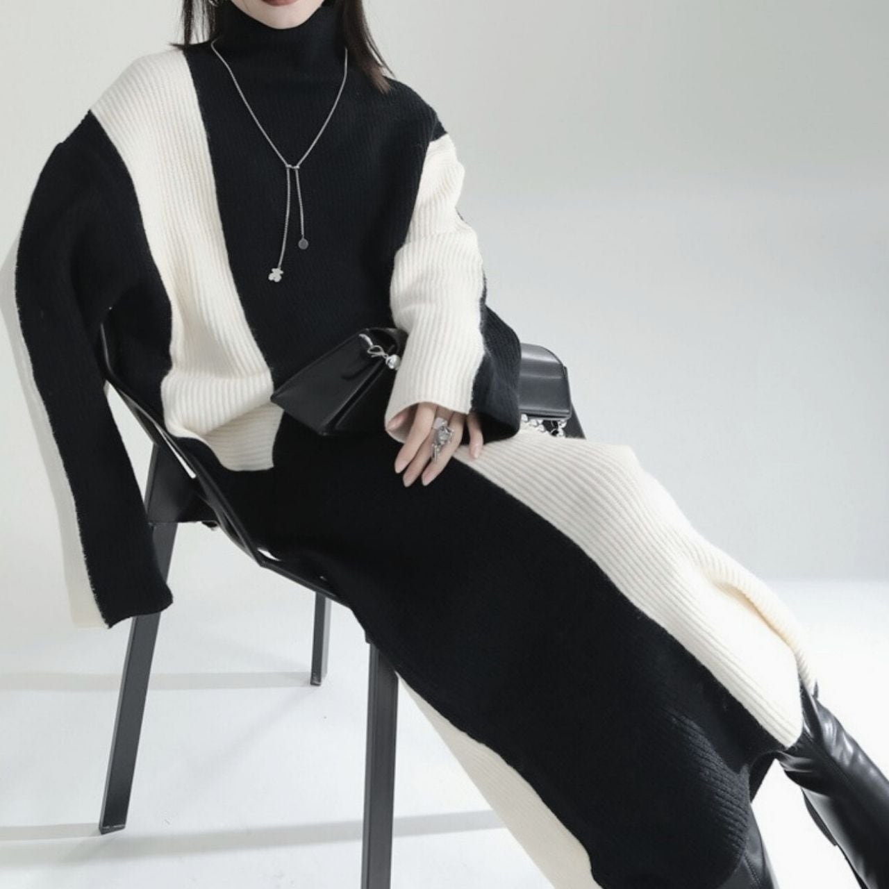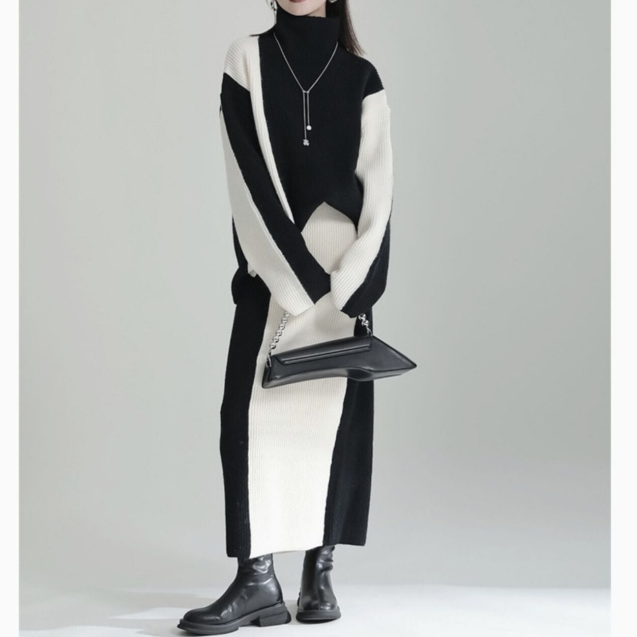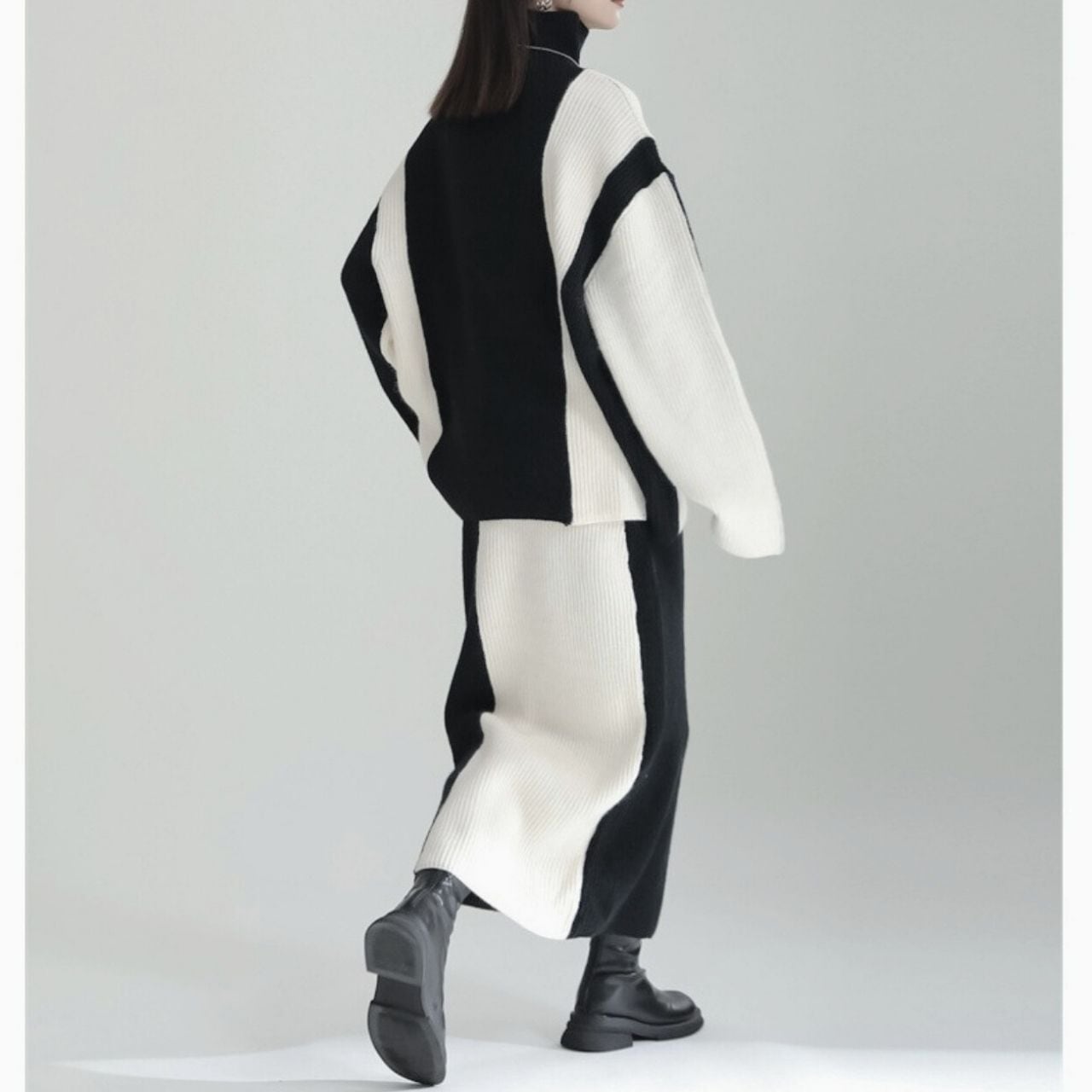 シックなモノトーンで洗練されたスタイルを演出するニットセットアップ。