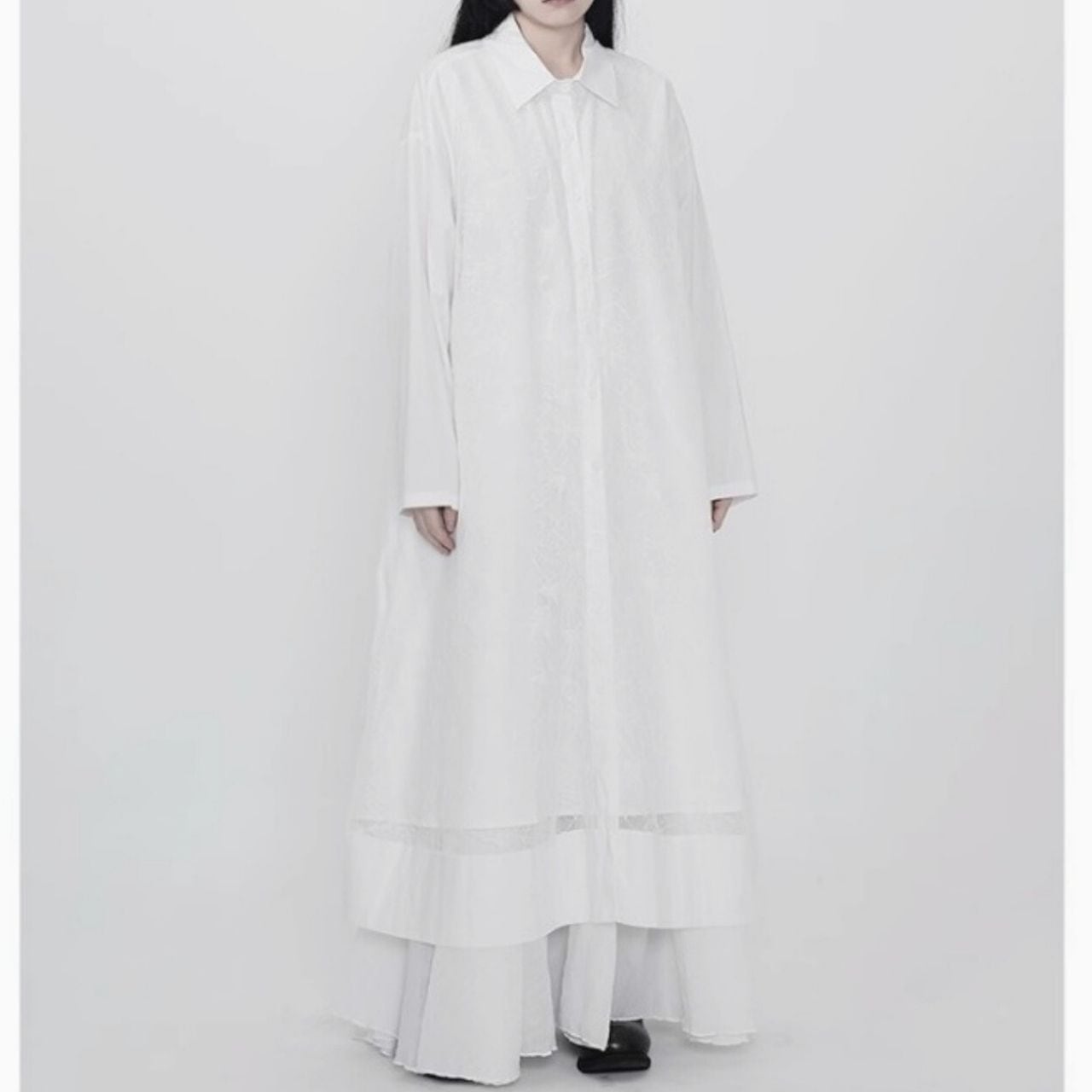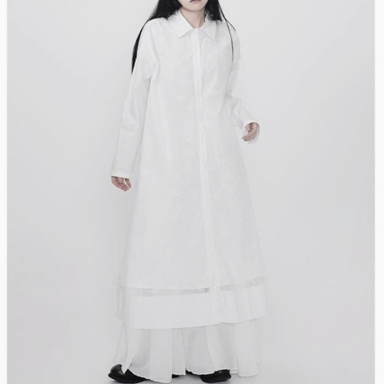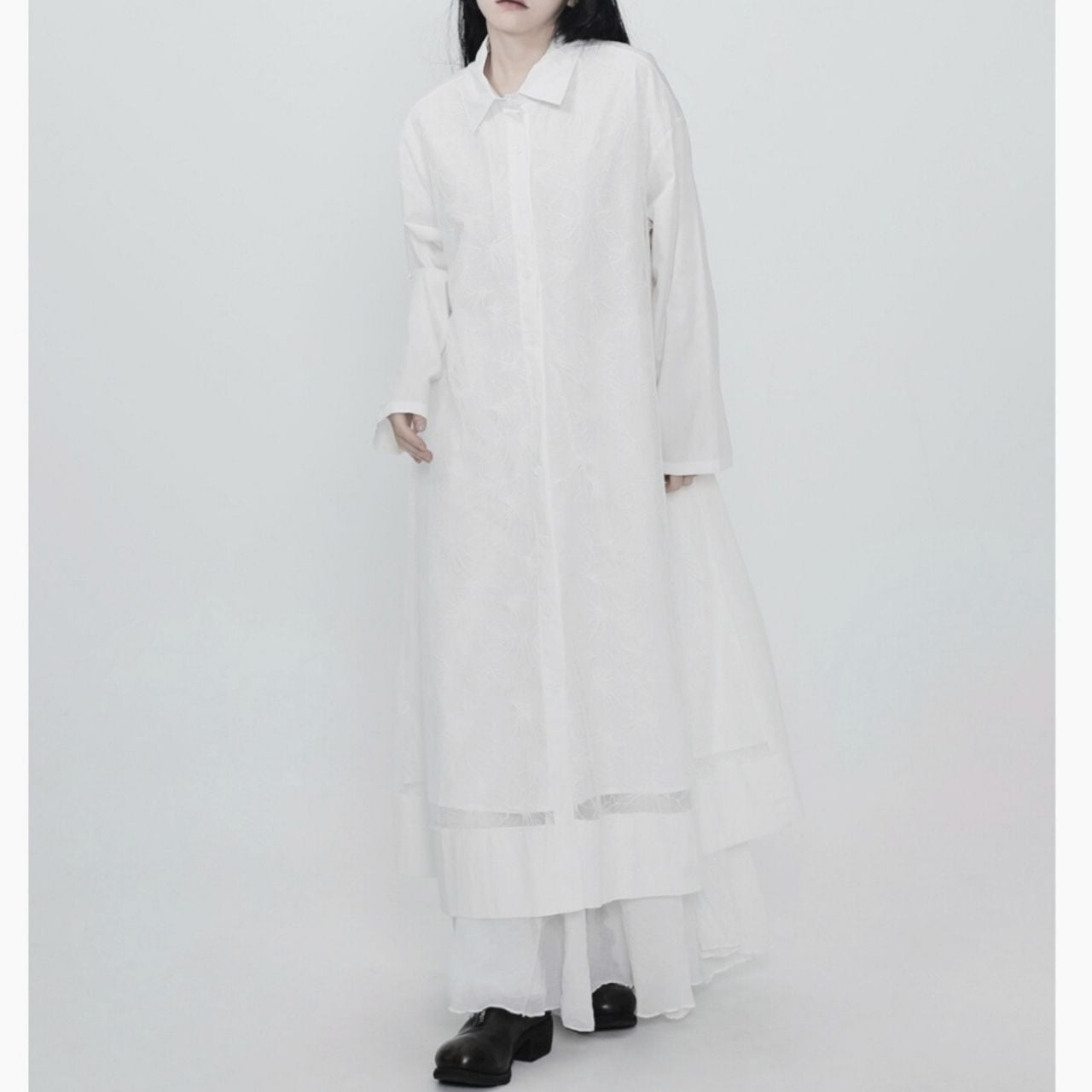メッシュレイヤードデザインが魅力的なロングシャツワンピース。