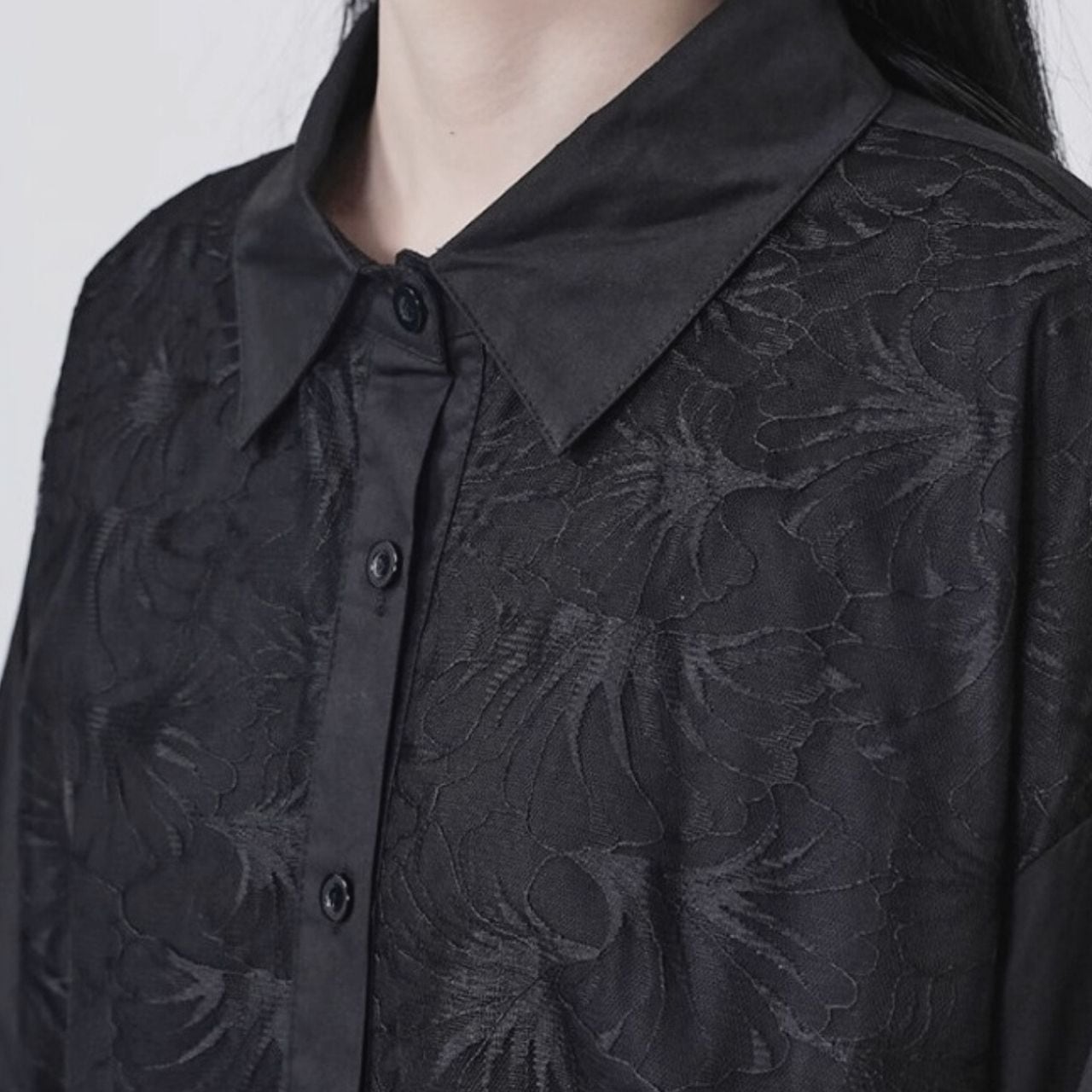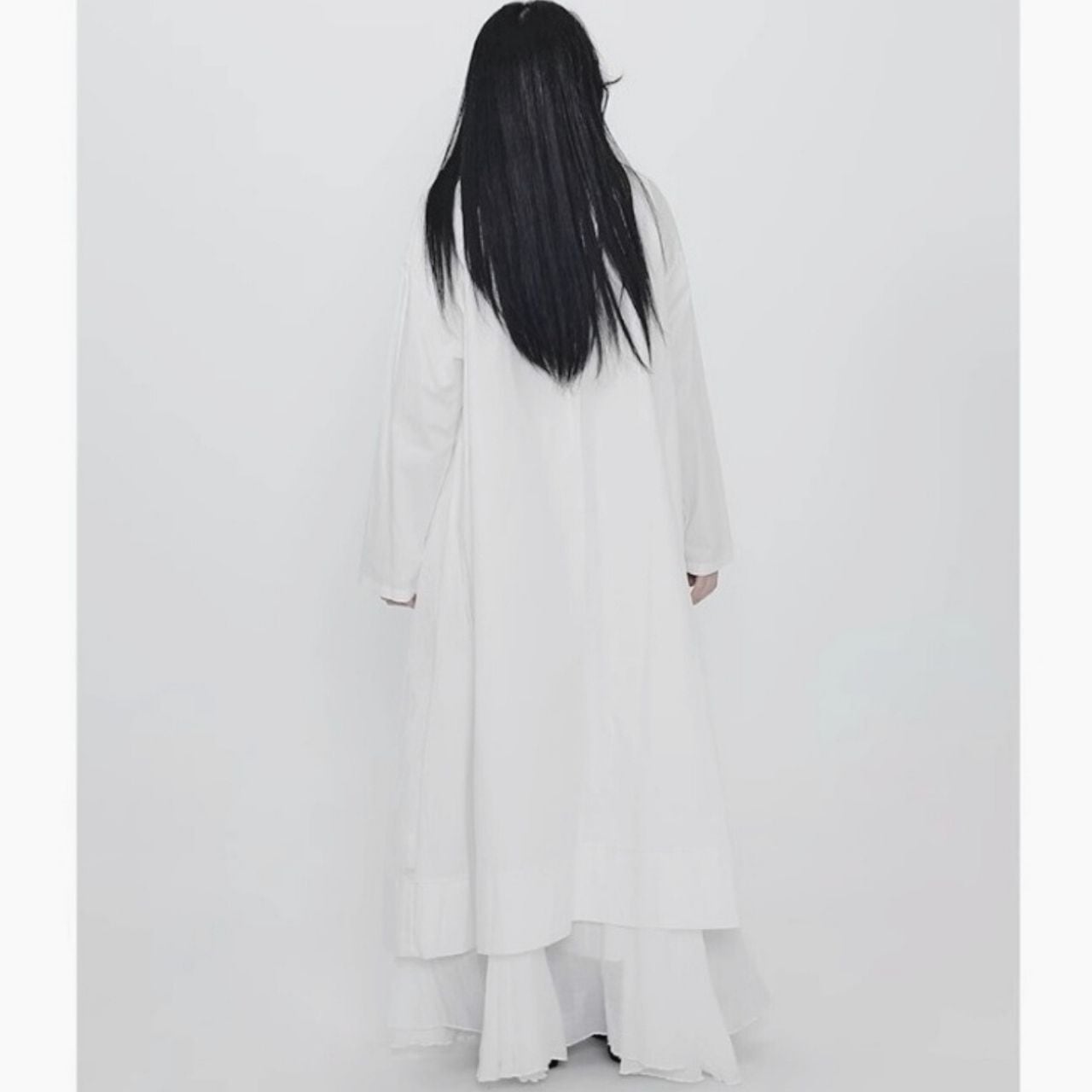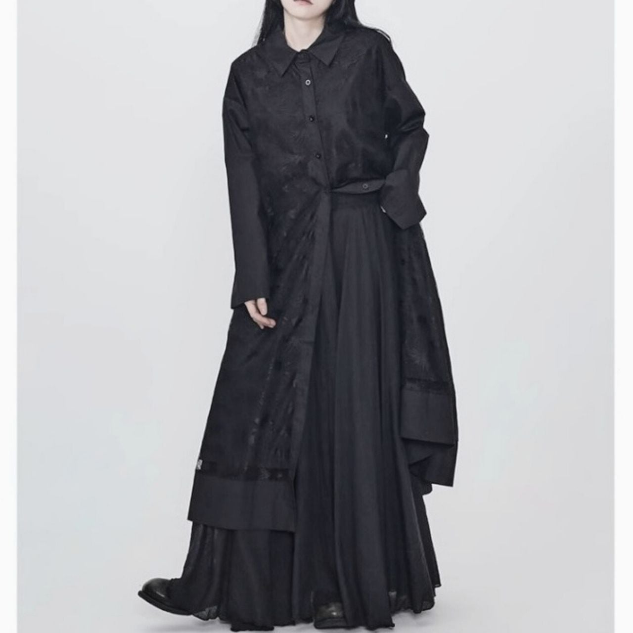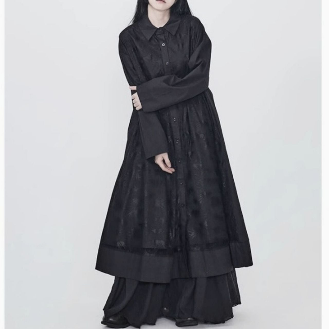 メッシュレイヤードデザインが魅力的なロングシャツワンピース。