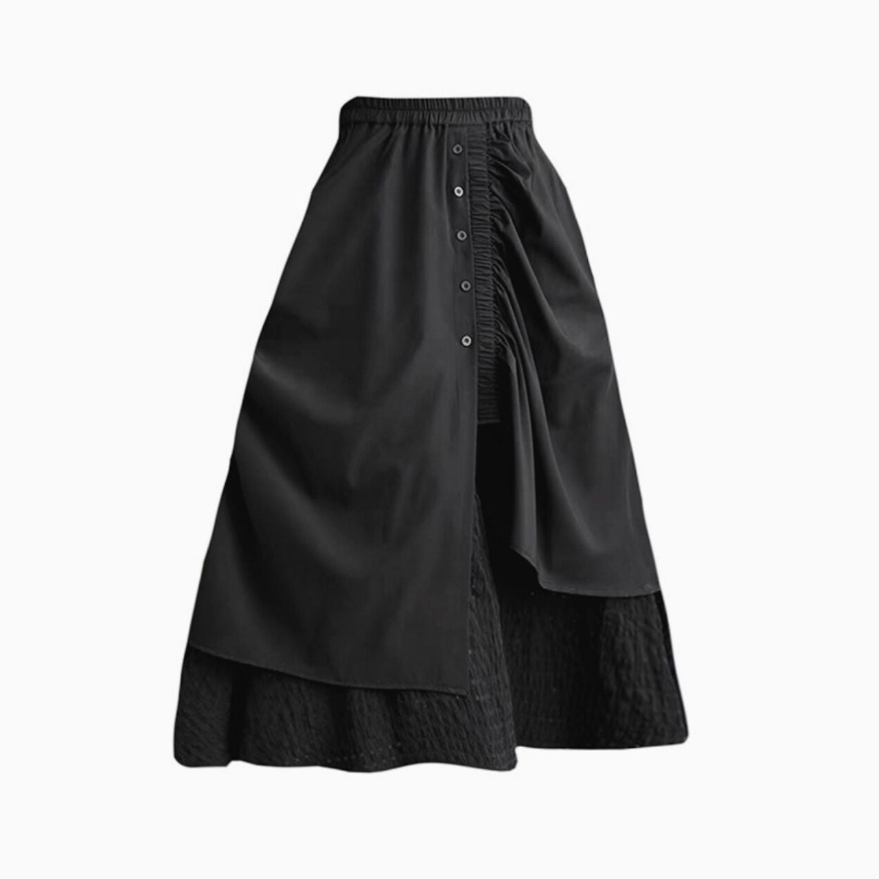 ボタン装飾がアクセントとなり、シンプルなトップスと合わせるだけで、こなれた着こなしが完成します。