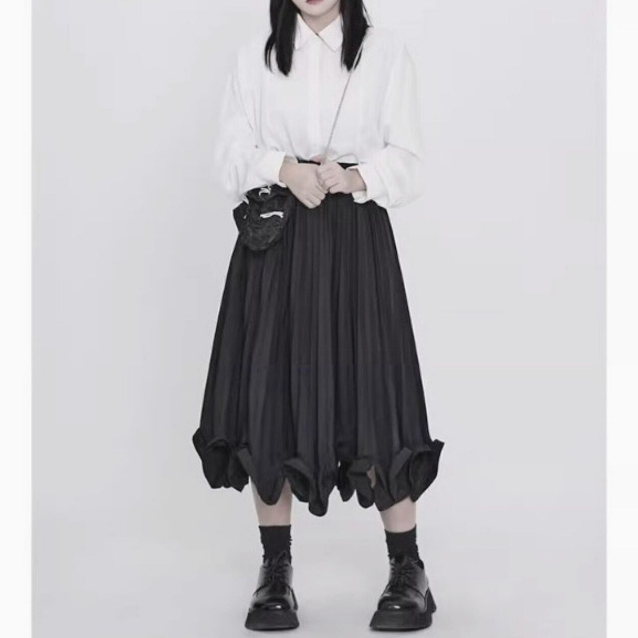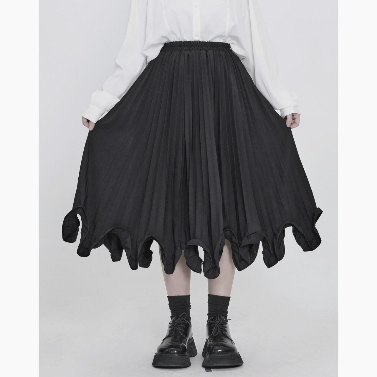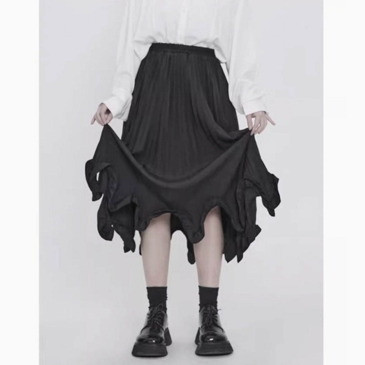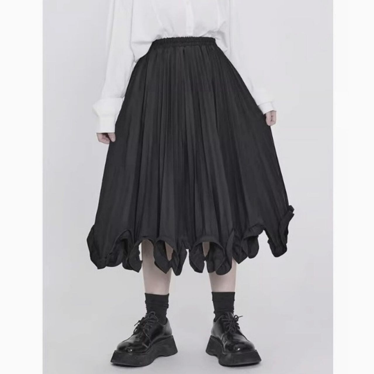 裾のアシンメトリーなフリルが目を惹くミディスカート。