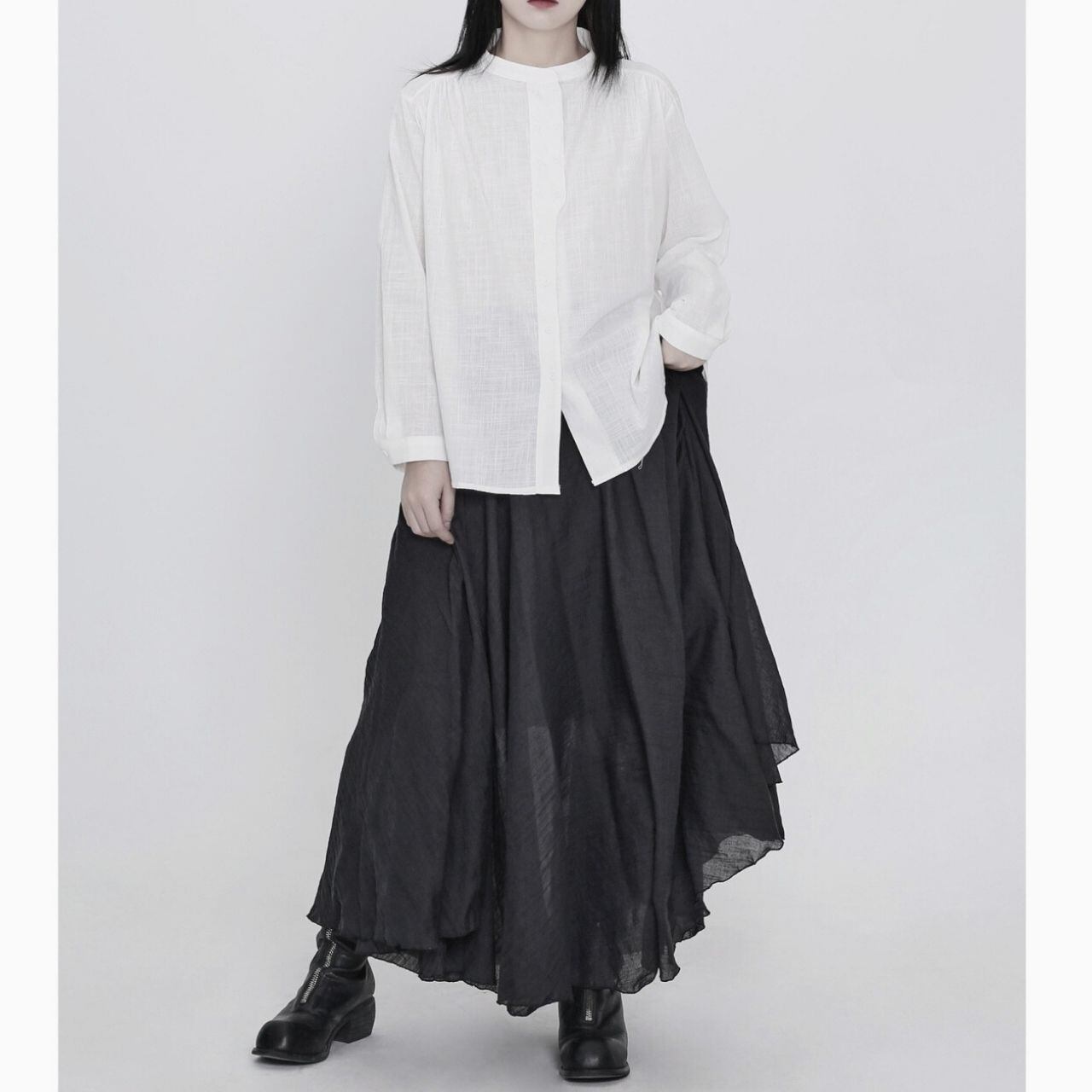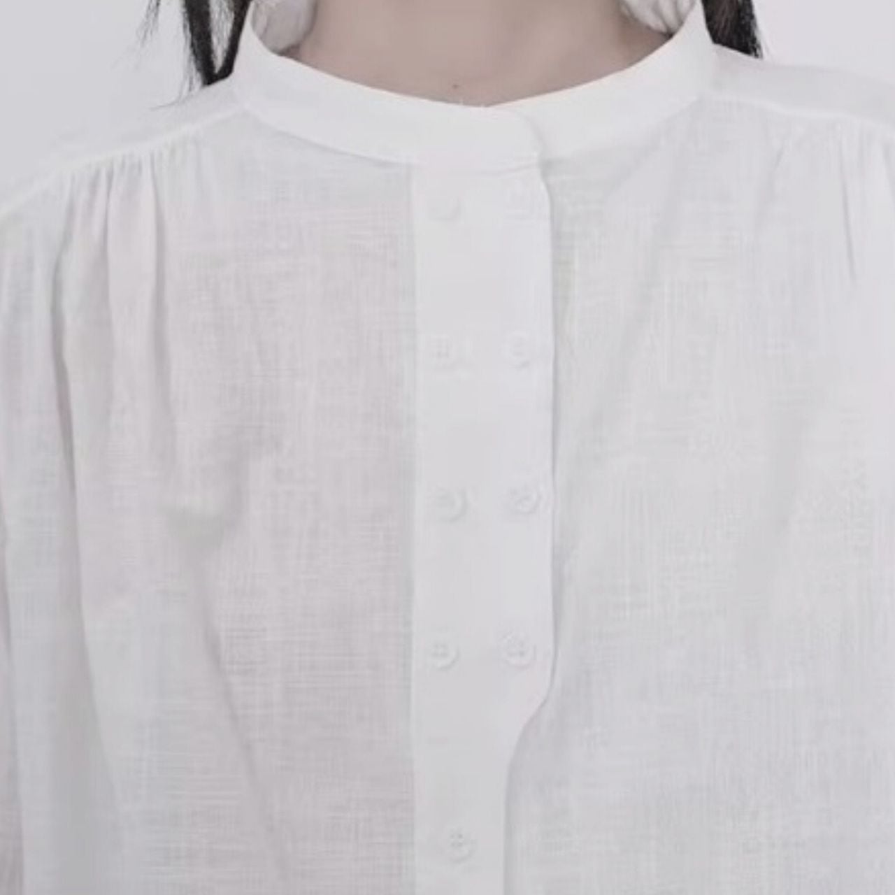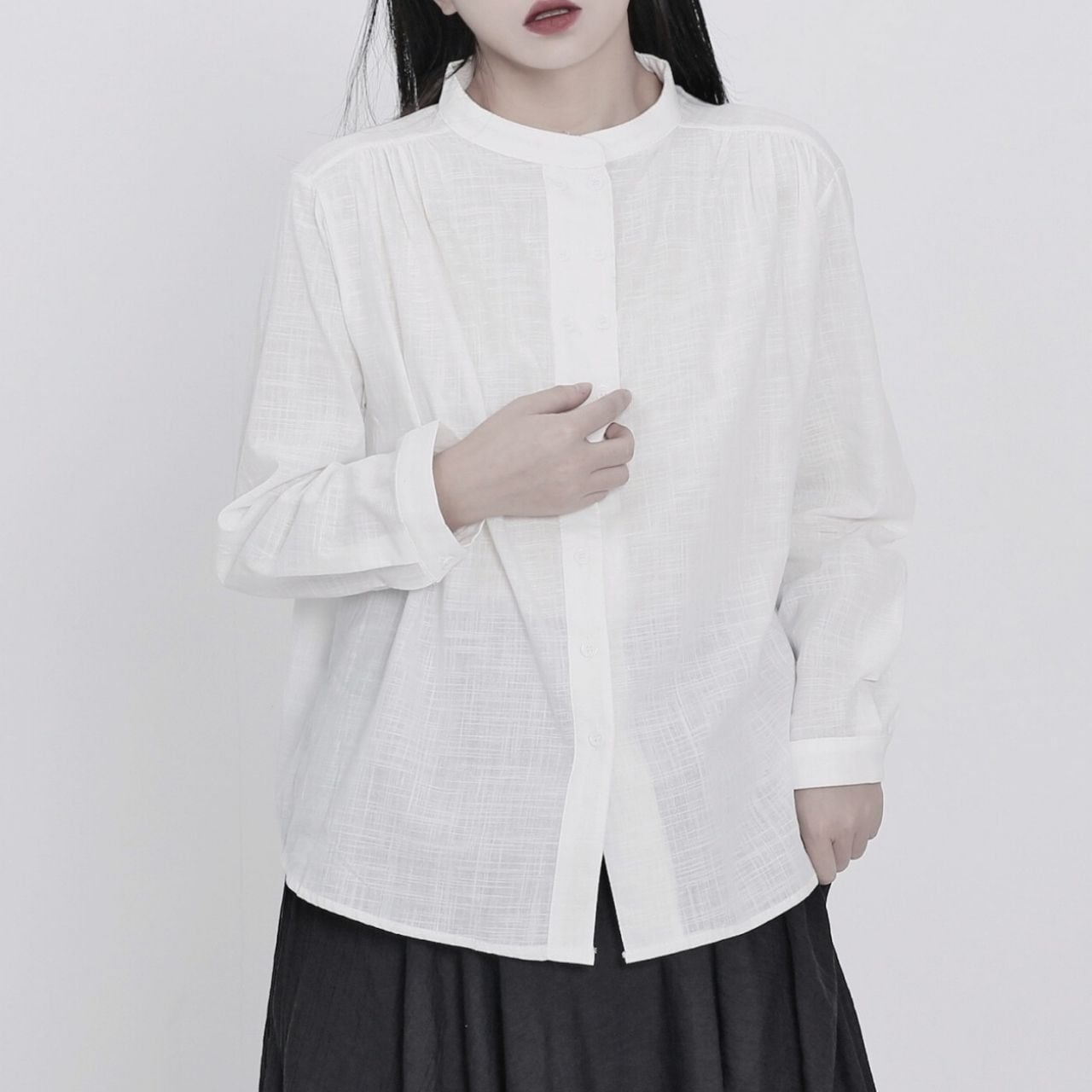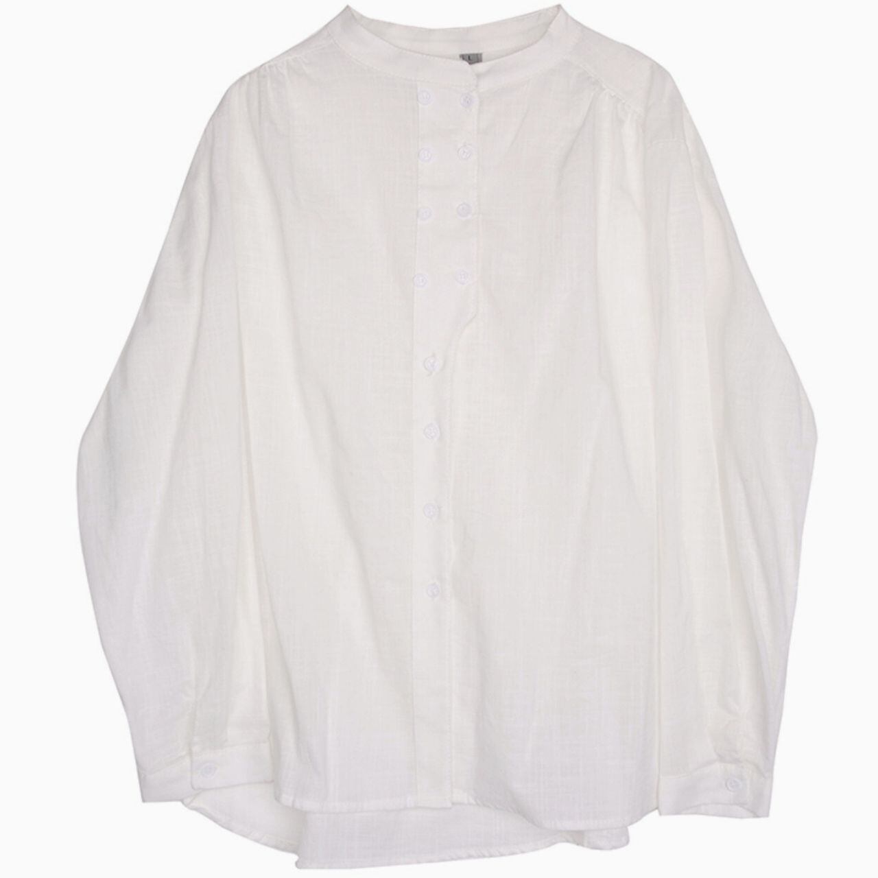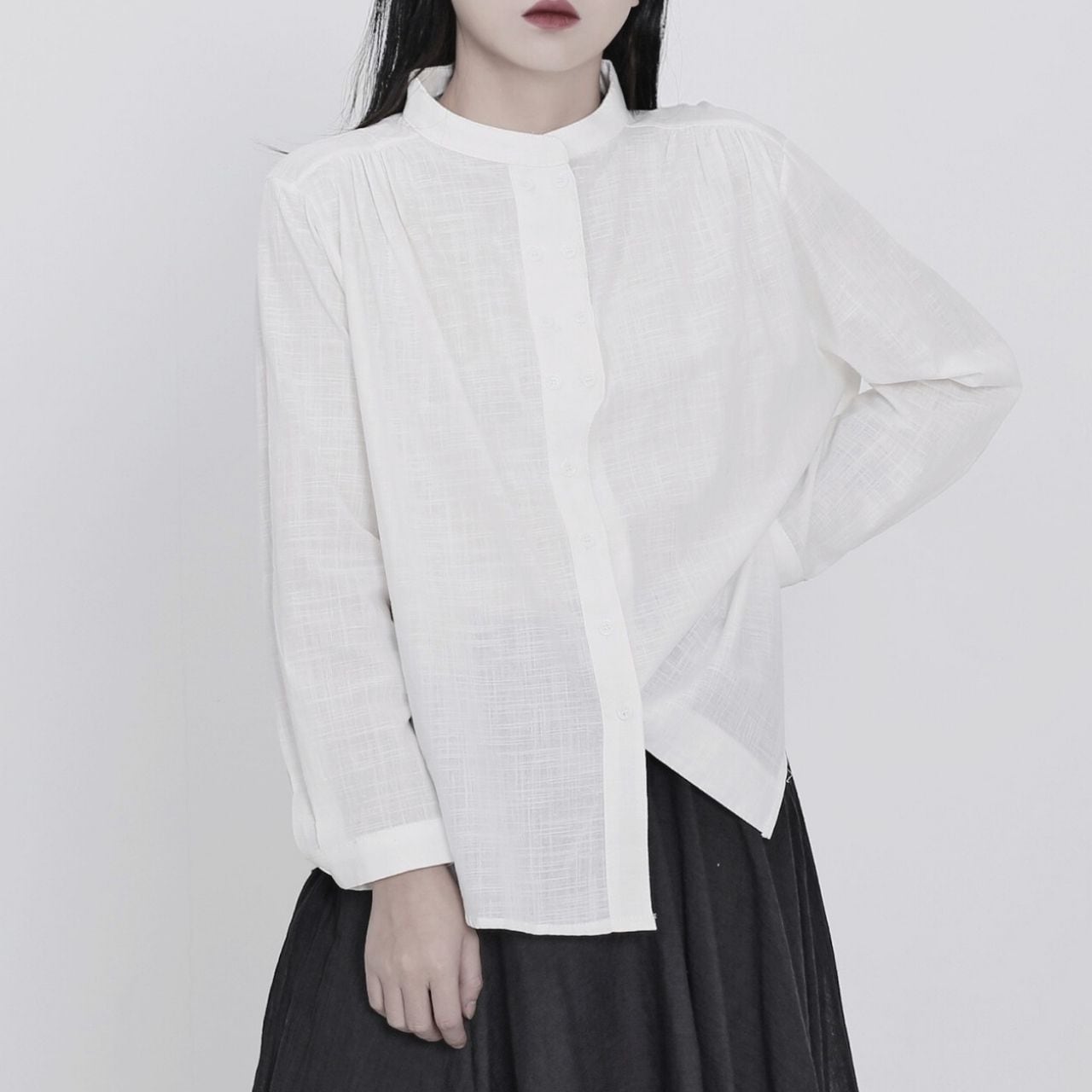 スタンドカラーとボタンダウンのデザインが洗練された印象を与えるシャツ。
