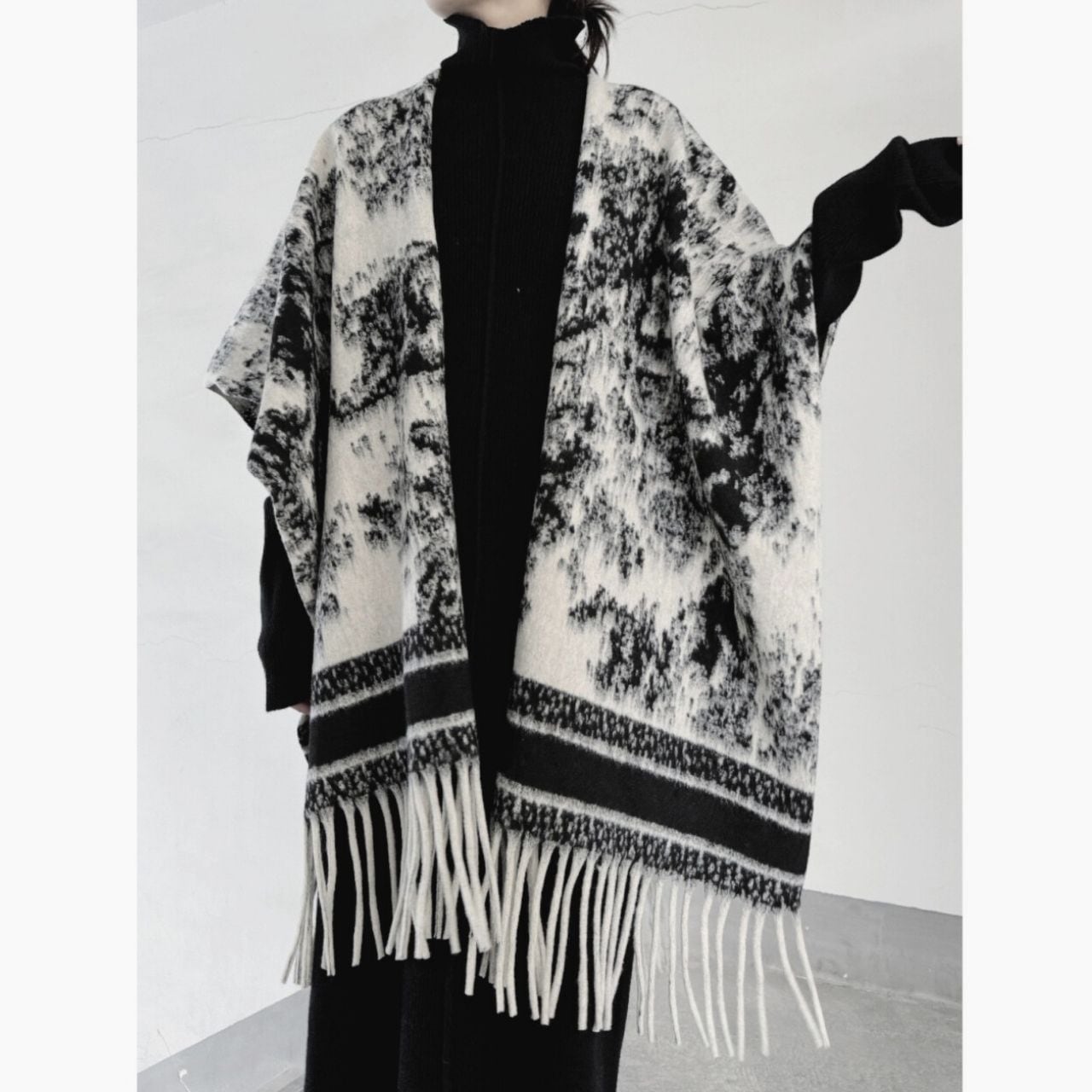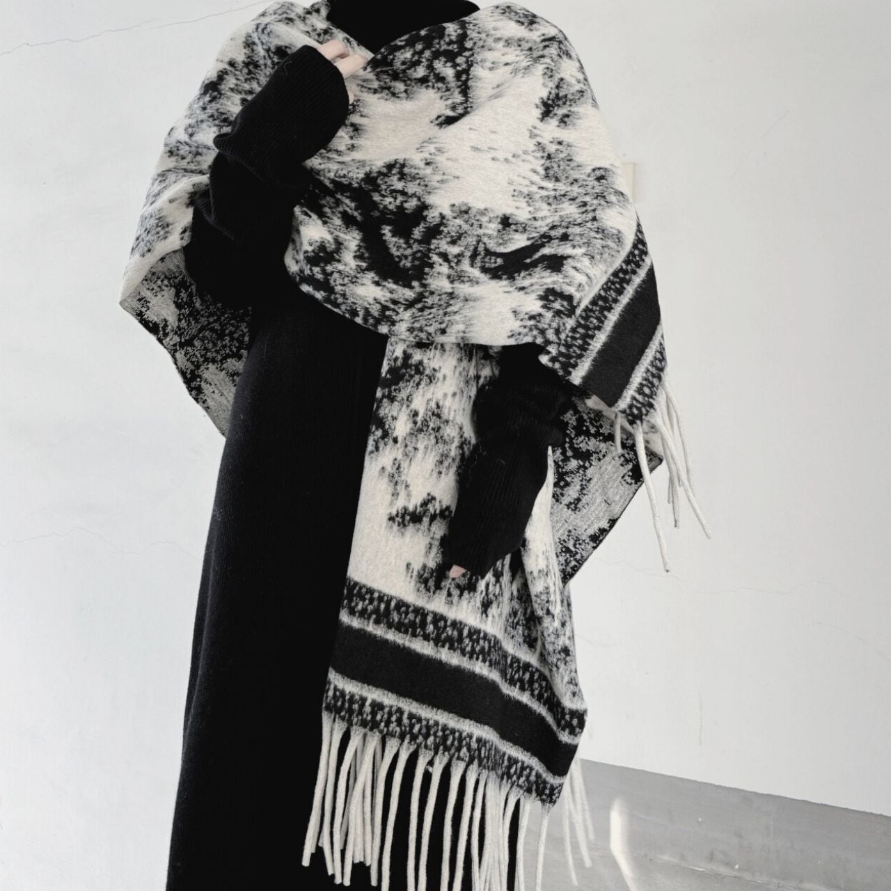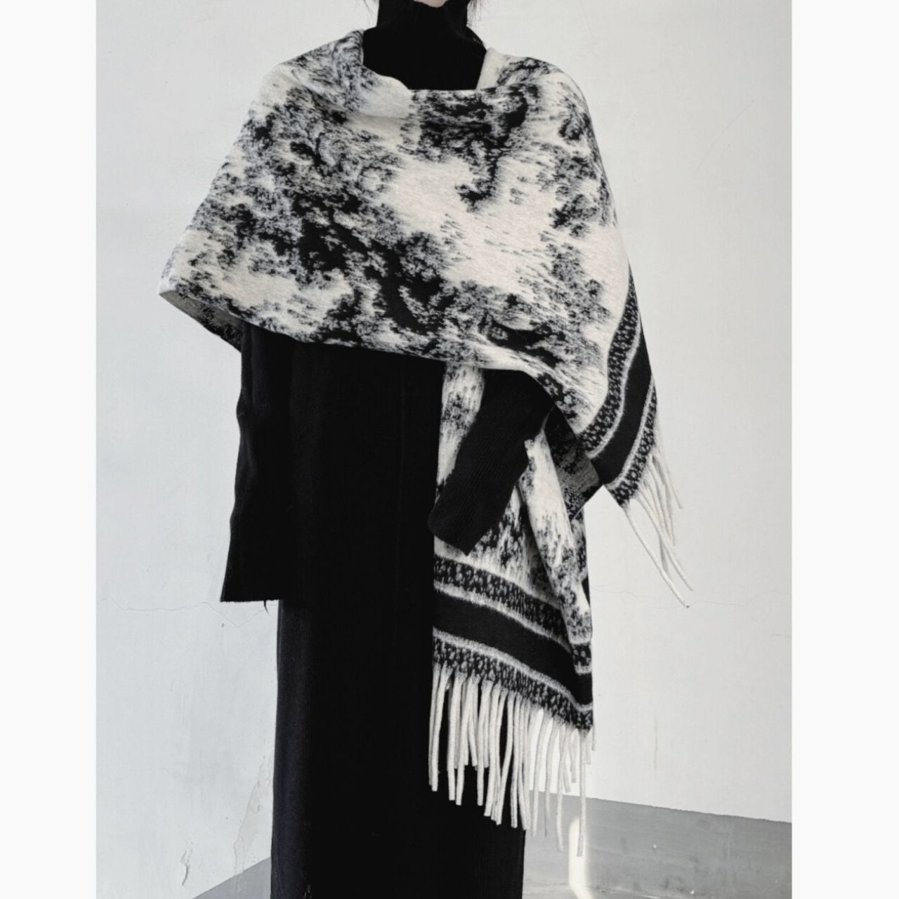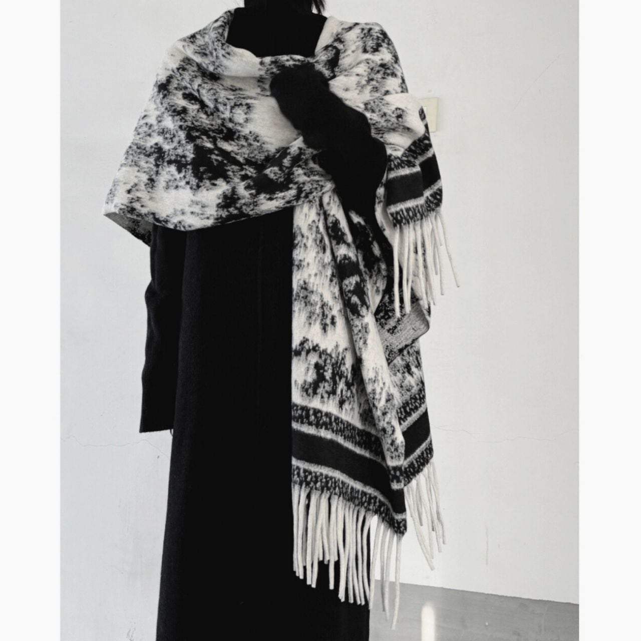 大判のグラデーション柄が目を惹く、フリンジ付きオーバーサイズストール。