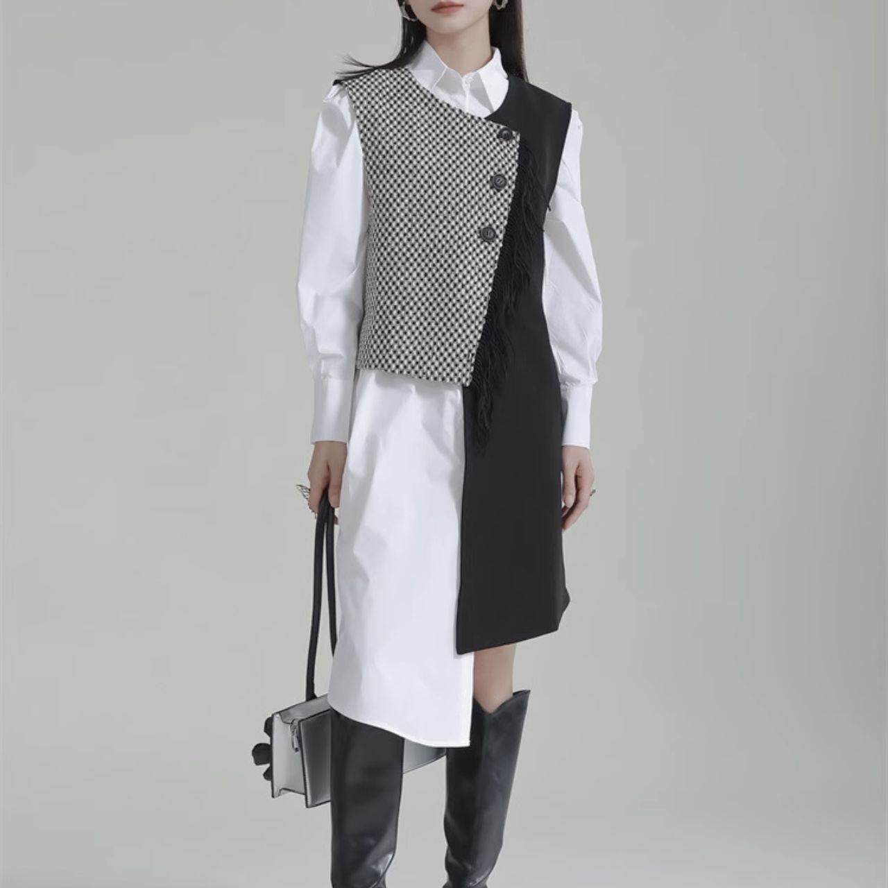 白黒のツィード素材と無地のブラックの生地の組み合わせが、モードで洗練された印象を与えます。