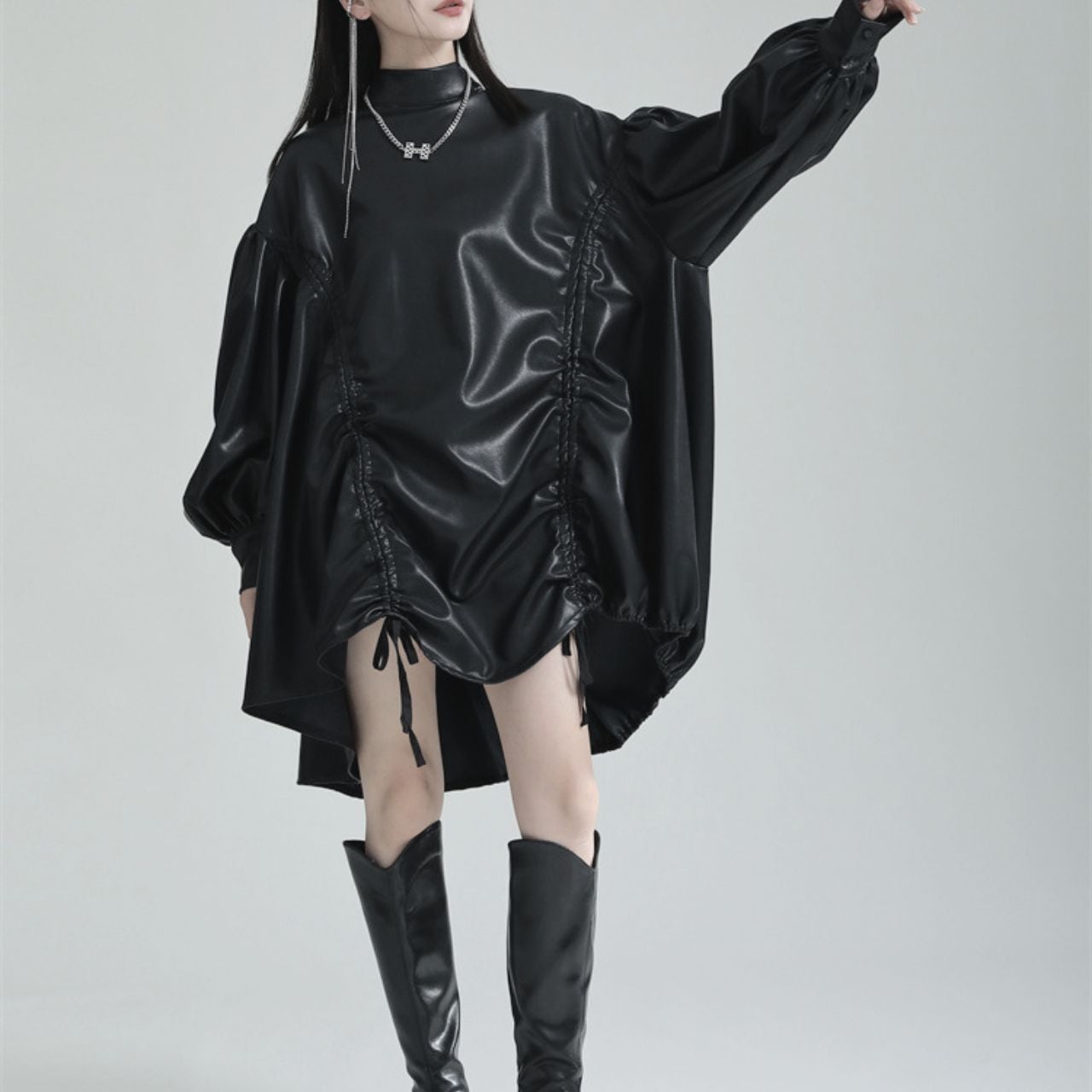高めのネックラインとバルーン袖が特徴的なミニドレス。