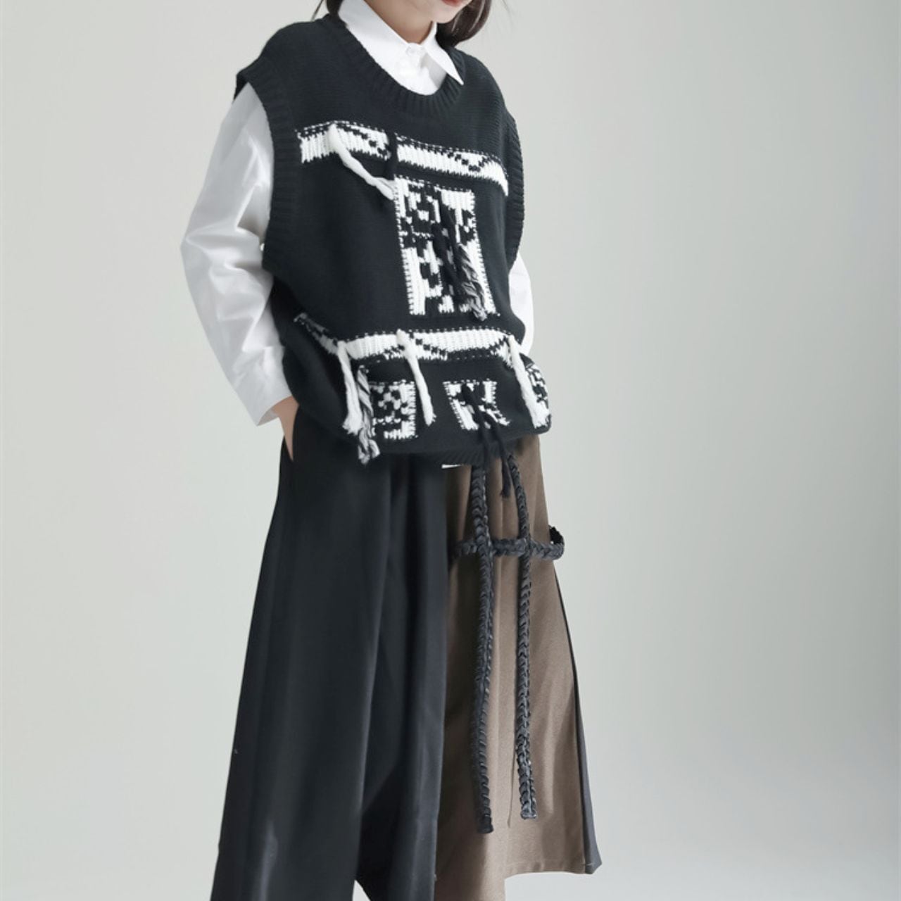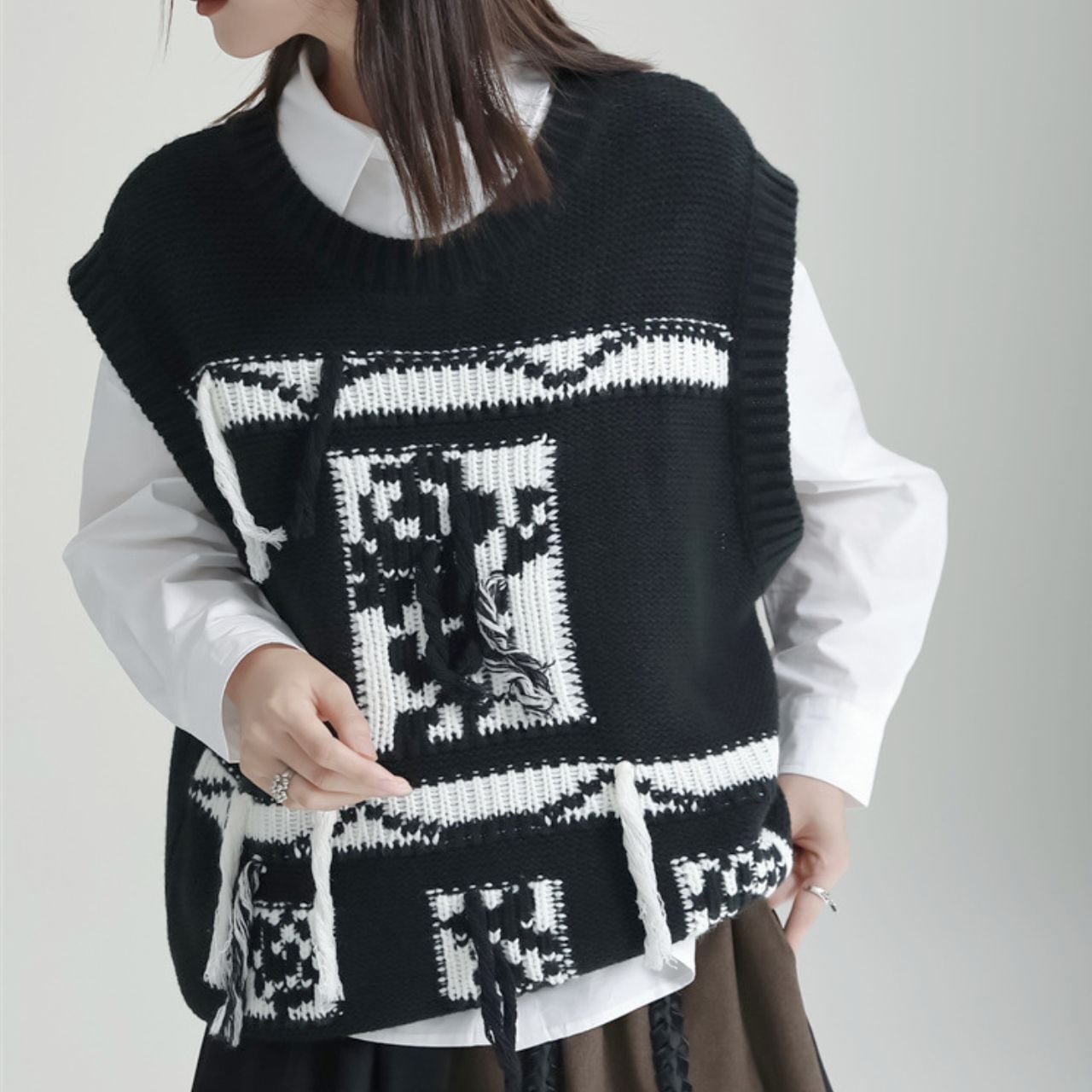 幾何学模様とタッセルがアクセントになったニットベスト。