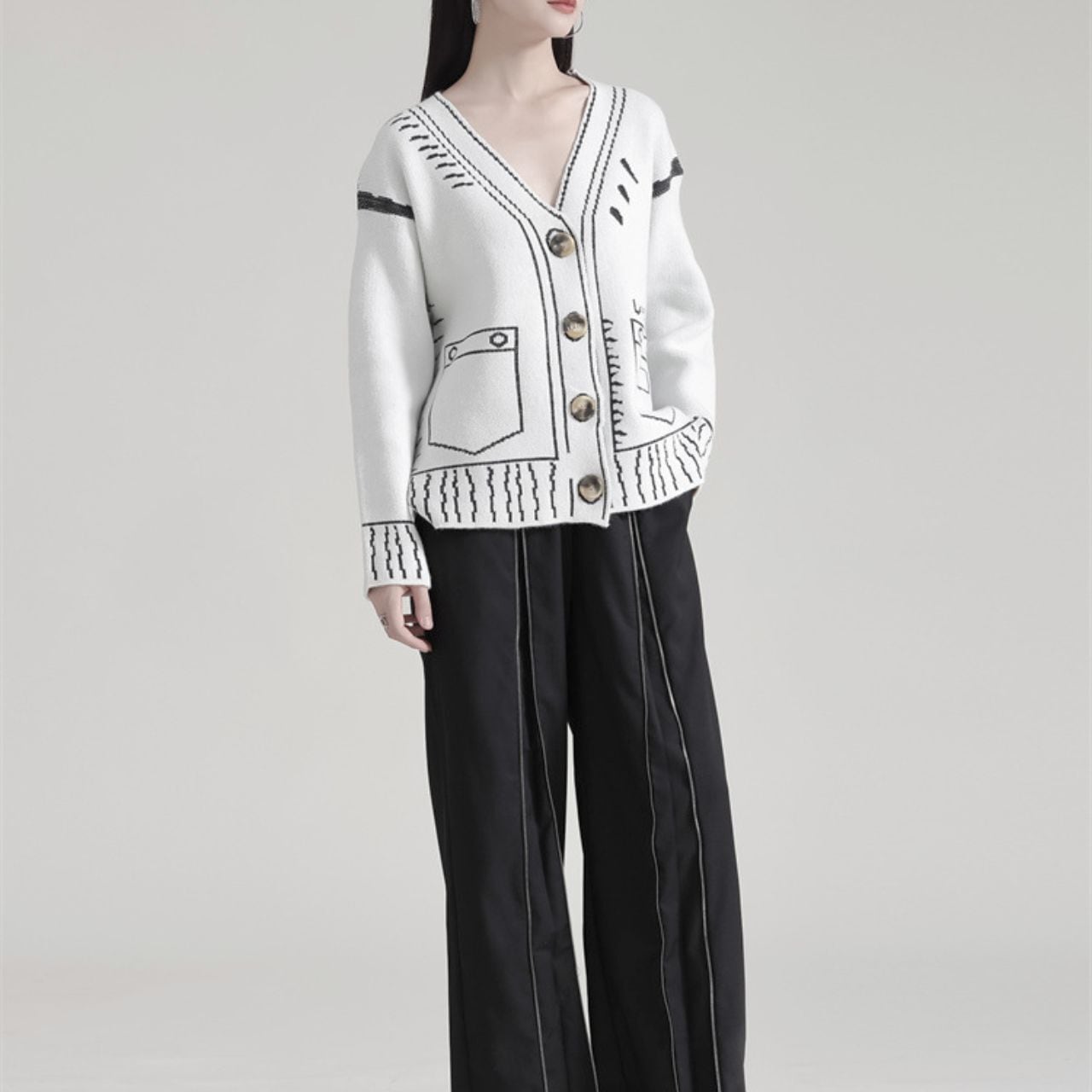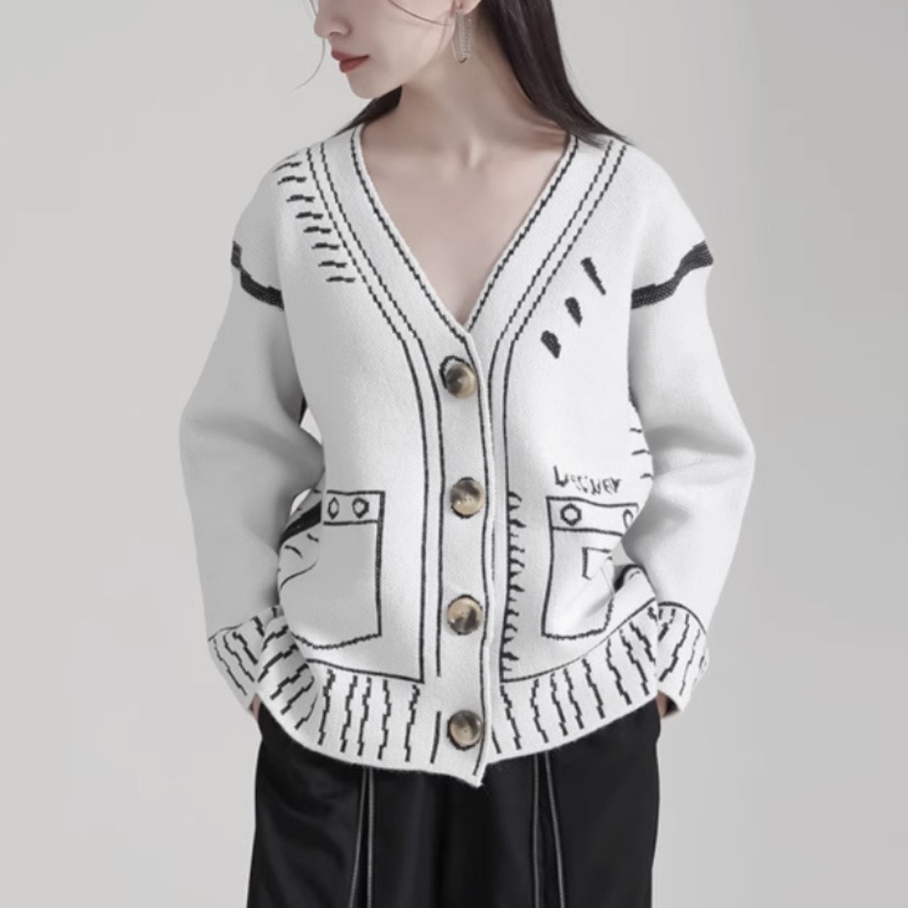 ラインで描かれたユニークなポケットやステッチが特徴的なニットカーディガン。
