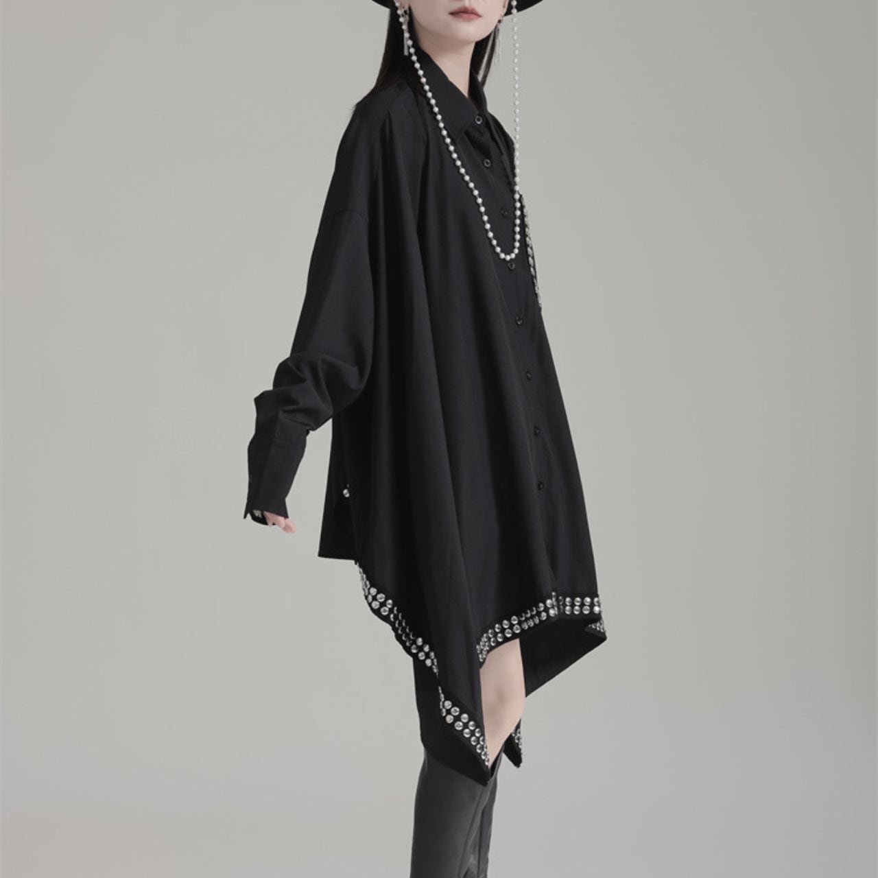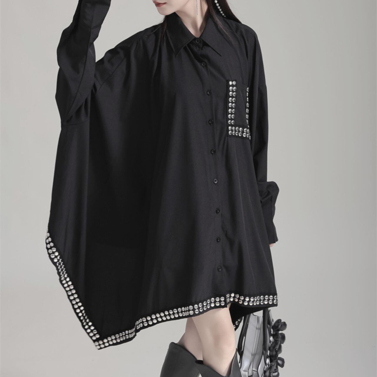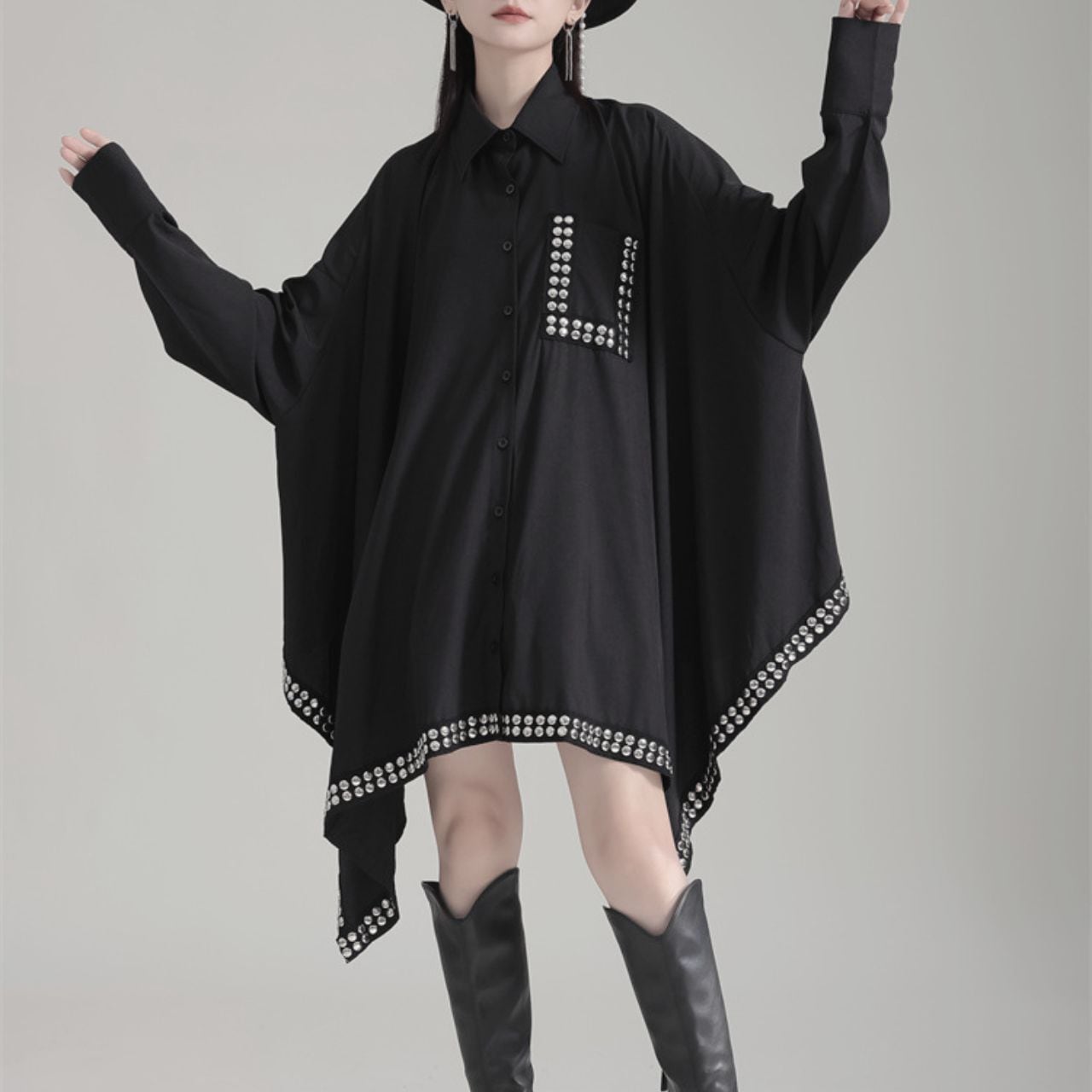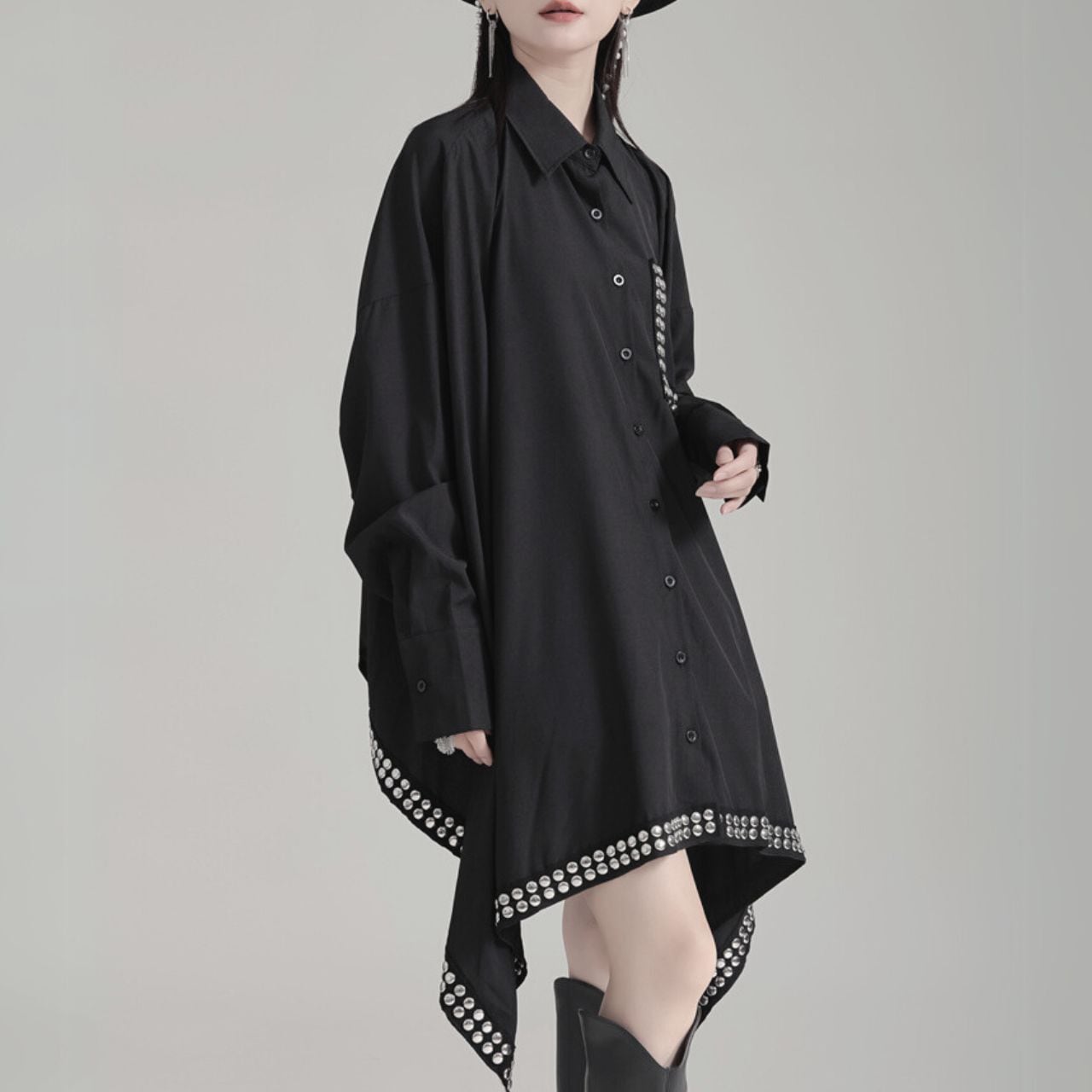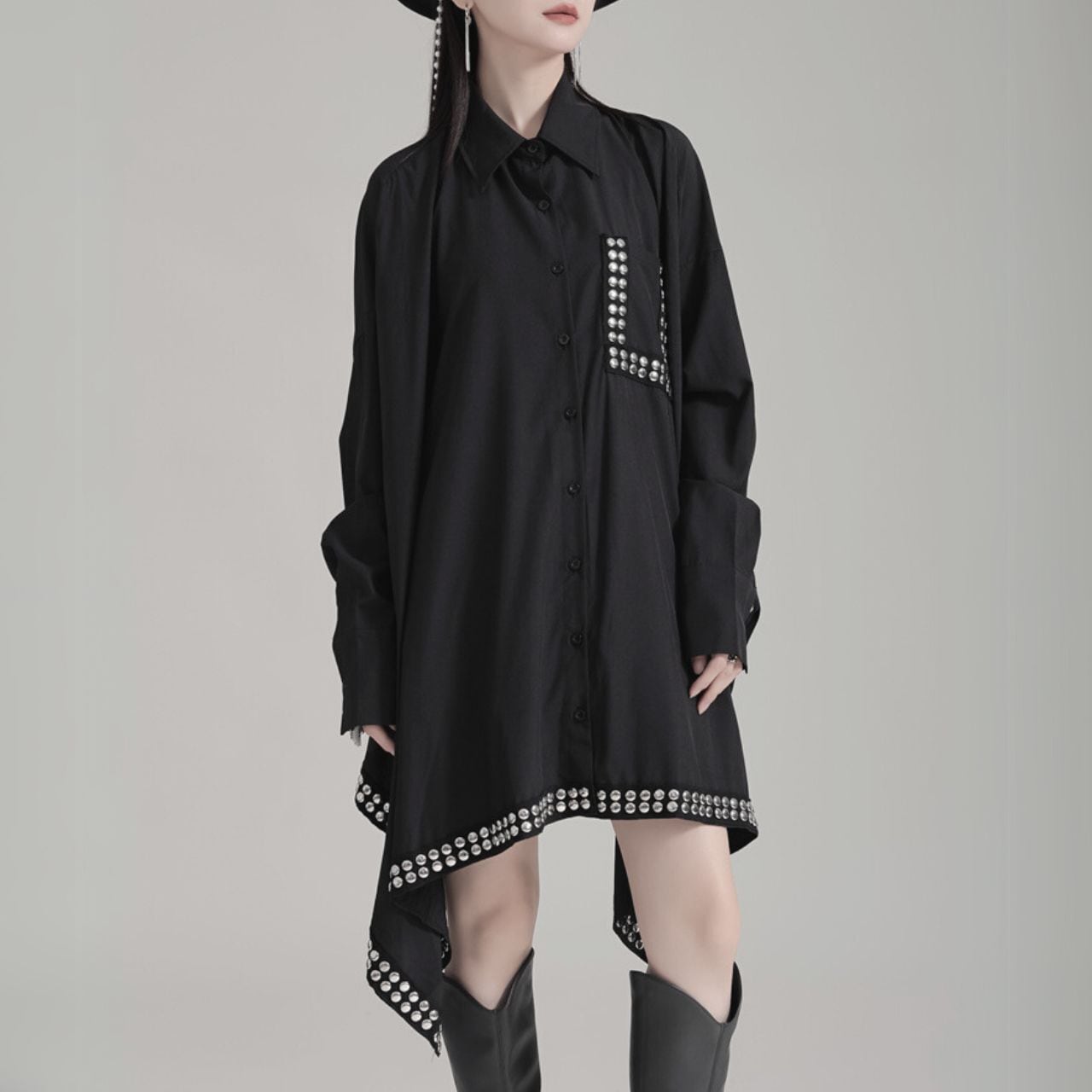 スタッズがアクセントになった、ドロップショルダーのオーバーサイズロングシャツワンピース。